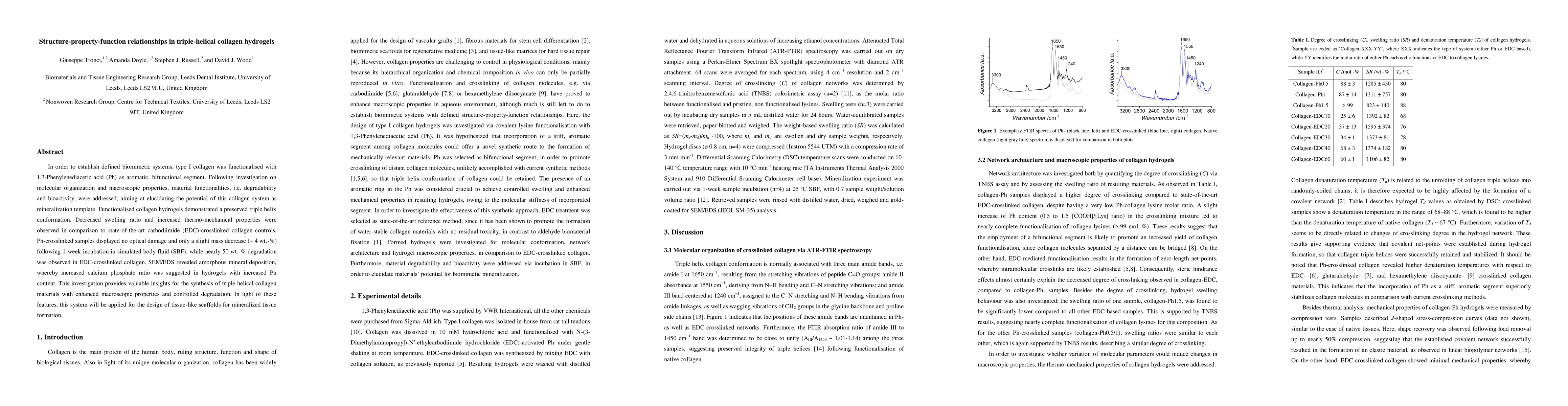 This study functionalizes type I collagen with 1,3-Phenylenediacetic acid to create triple helical collagen hydrogels, showing improved thermo-mechanical properties and reduced degradation compared to carbodiimide-crosslinked controls. The functionalized hydrogels exhibit enhanced mineralization potential, suggesting their utility in developing scaffolds for mineralized tissue engineering.