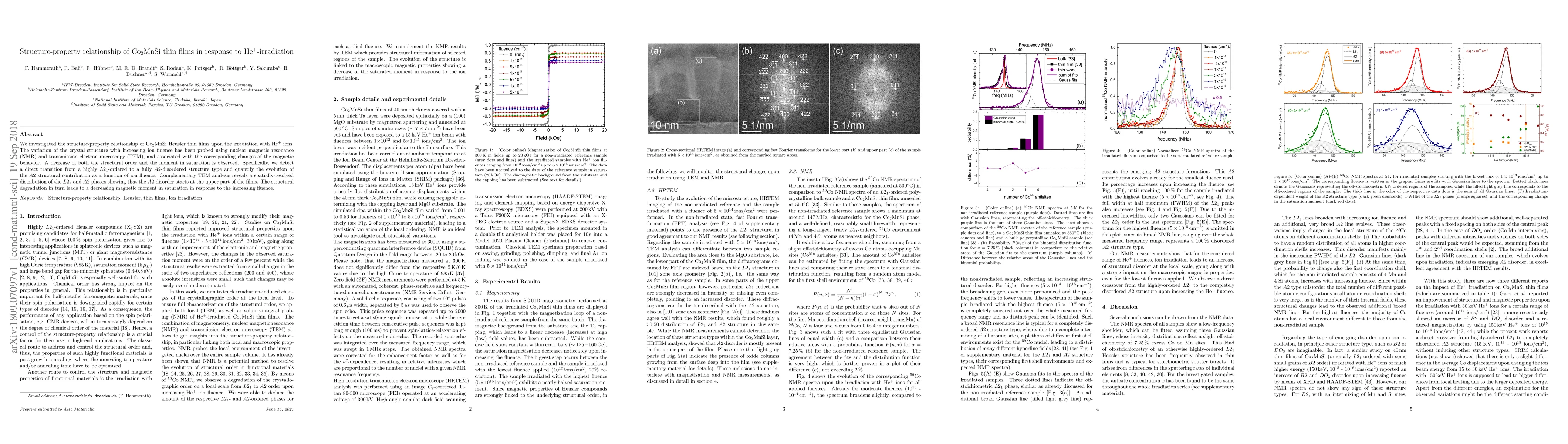 This study investigates the structural and magnetic changes in Co$_2$MnSi Heusler thin films under He$^+$-irradiation, revealing a transition from $L2_1$-ordered to $A2$-disordered phases via NMR and TEM, which correlates with a decrease in magnetic moment. TEM shows $A2$ disorder initiation at the film's upper part.