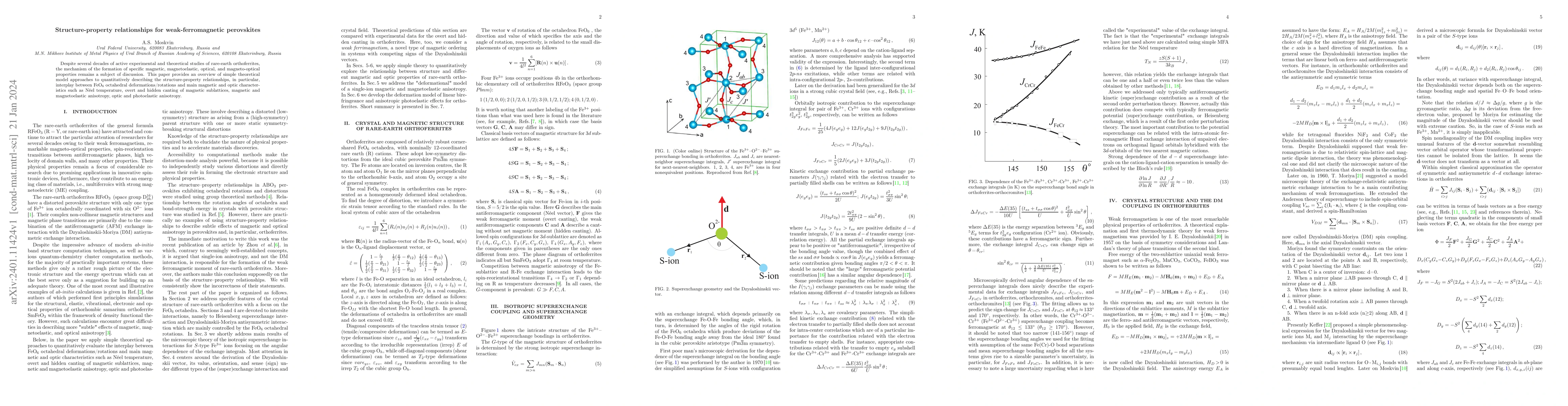 This paper reviews theoretical models explaining the structure-property relationships in weak-ferromagnetic perovskites, focusing on the impact of FeO$_6$ octahedral deformations/rotations on magnetic, magnetoelastic, optical, and magneto-optical properties. It aims to quantify the interplay between these deformations and key characteristics like Néel temperature and magnetic anisotropy.