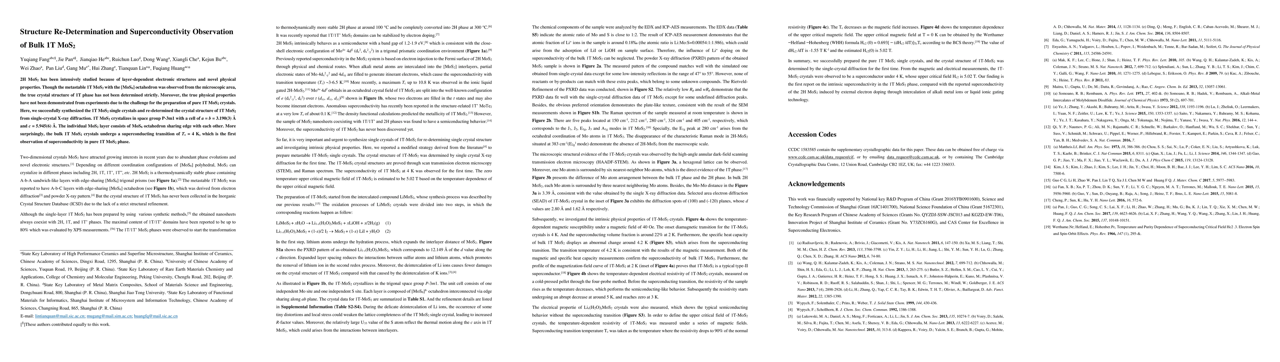 Researchers synthesized 1T MoS2 single crystals and re-determined its crystal structure, finding it crystallizes in the P-3m1 space group. They also observed superconductivity in bulk 1T MoS2 with a transition temperature of 4 K, marking the first such observation in this phase.