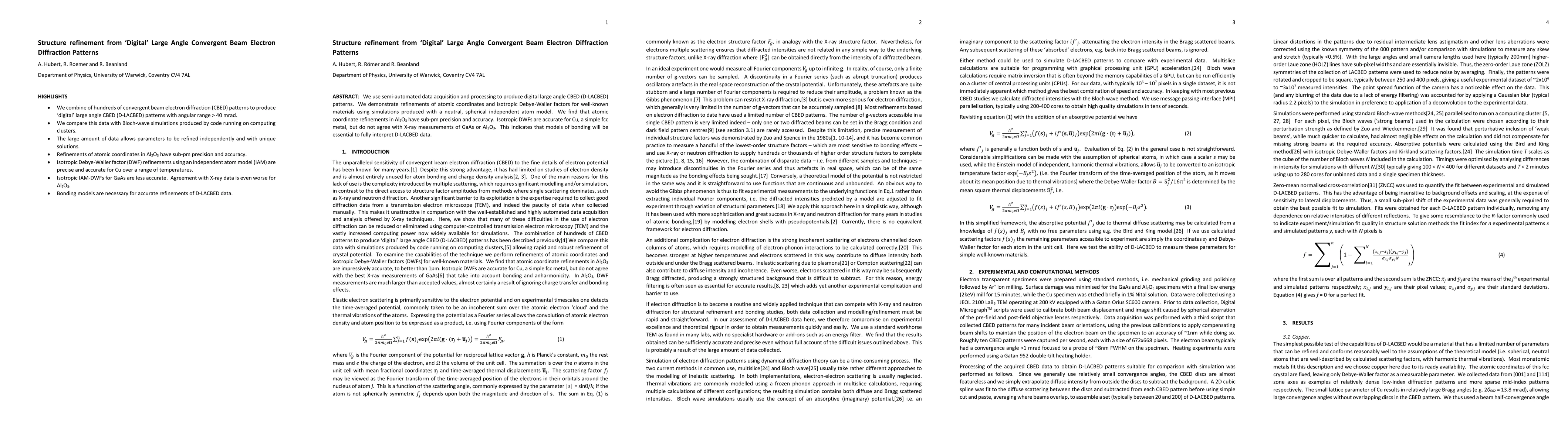 This paper presents a semi-automated method for refining atomic coordinates and Debye-Waller factors using digital large angle convergent beam electron diffraction (D-LACBED). The method achieves sub-pm precision in refining Al2O3 atomic coordinates but requires improved bonding models to accurately interpret isotropic Debye-Waller factors for materials like GaAs and Al2O3.