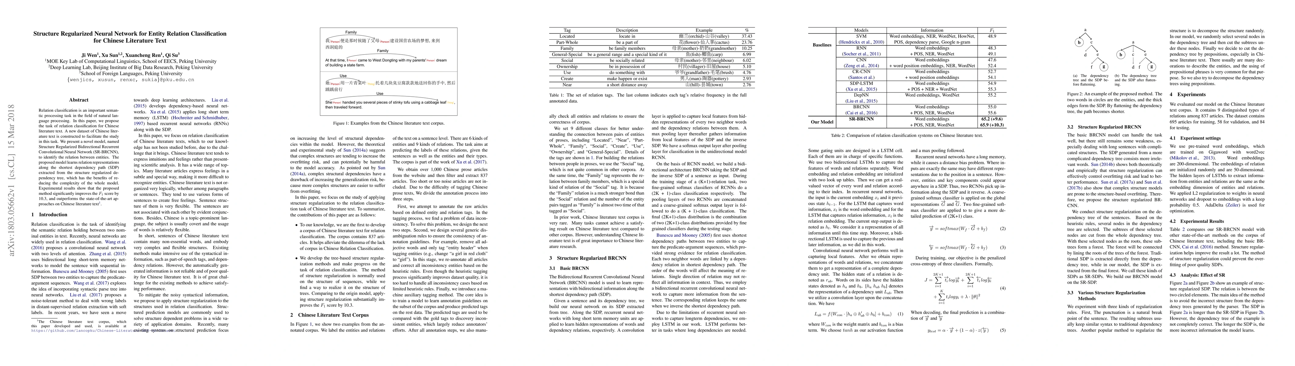This paper introduces a novel model, SR-BRCNN, for classifying relations in Chinese literature text. The model leverages a structure regularized dependency tree to extract the shortest dependency path, reducing complexity and improving performance, achieving a 10.3% improvement in F1 score over existing methods.