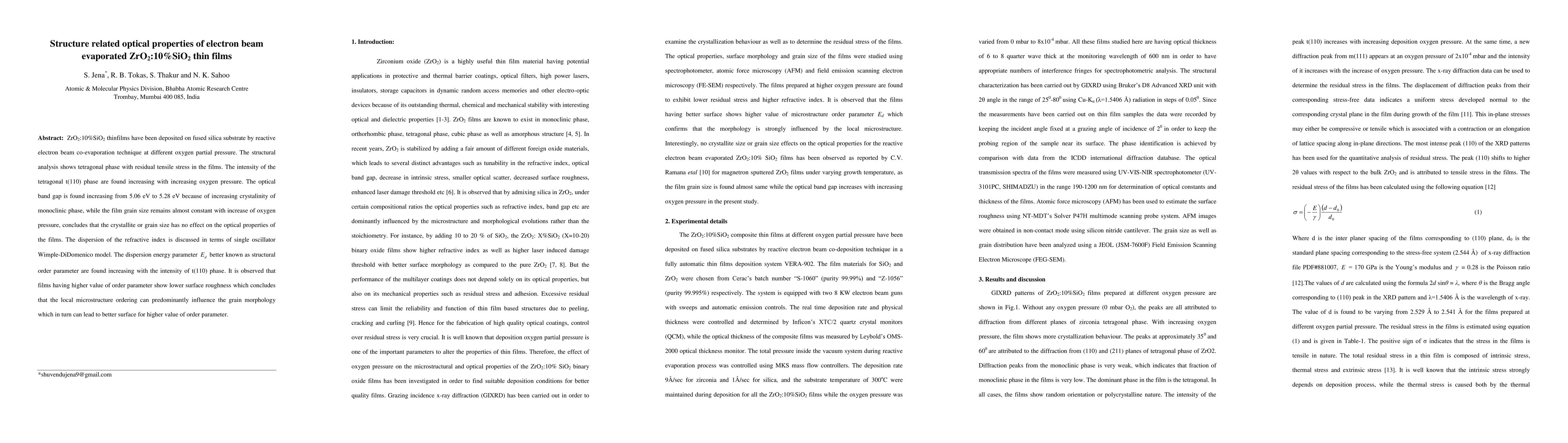 Researchers studied ZrO2:10%SiO2 thin films deposited by electron beam co-evaporation, finding that oxygen pressure affects optical properties without changing grain size. Higher oxygen pressure leads to better surface roughness and higher optical band gap.