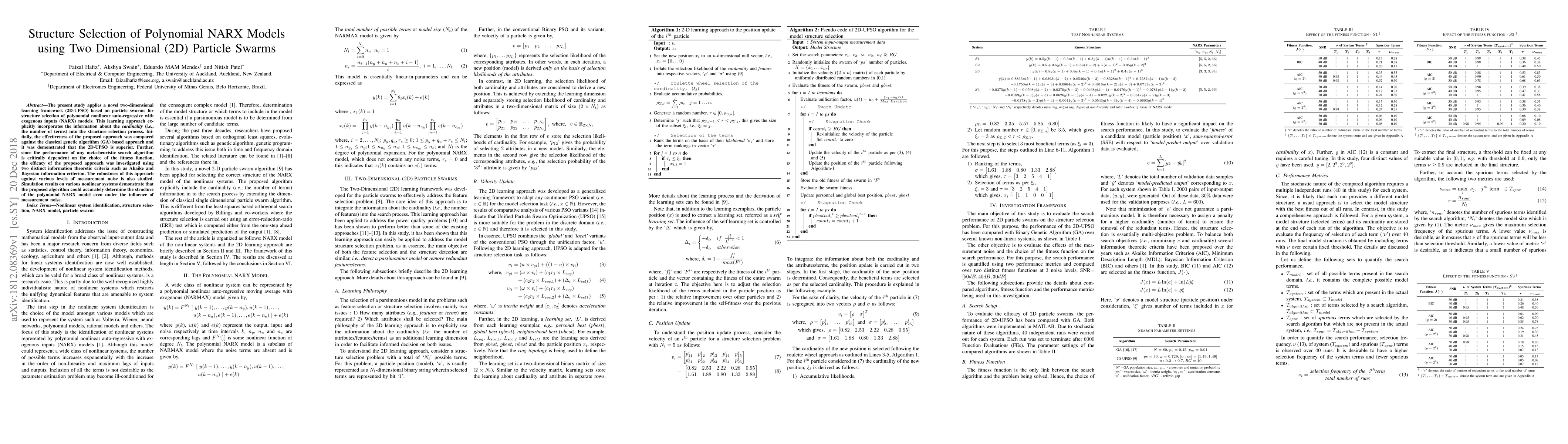A new method called 2D-UPSO outperforms a classical genetic algorithm in structure selection for polynomial NARX models, which can accurately determine model structure even with measurement noise.