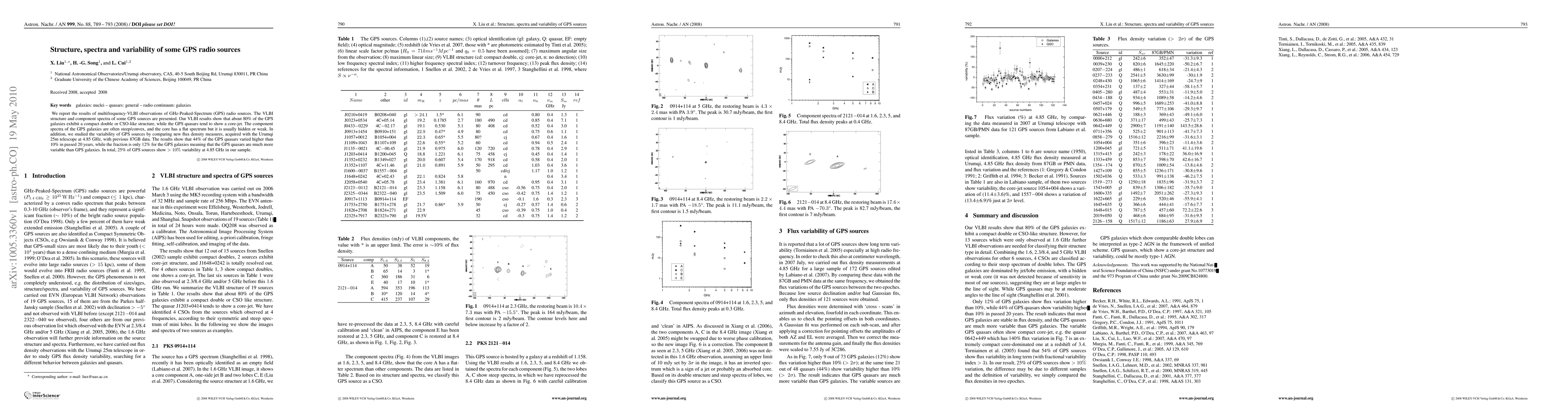 The study of GHz-Peaked-Spectrum (GPS) radio sources via multifrequency-VLBI observations reveals that 80% of GPS galaxies are compact doubles or CSO-like, while GPS quasars display core-jet structures. GPS galaxy components have steep/convex spectra with flat-spectrum cores, often hidden or weak. Variability analysis indicates GPS quasars vary more than GPS galaxies, with 44% showing >10% flux density changes over 20 years, compared to 12% for galaxies, and 25% overall variability in the sample.