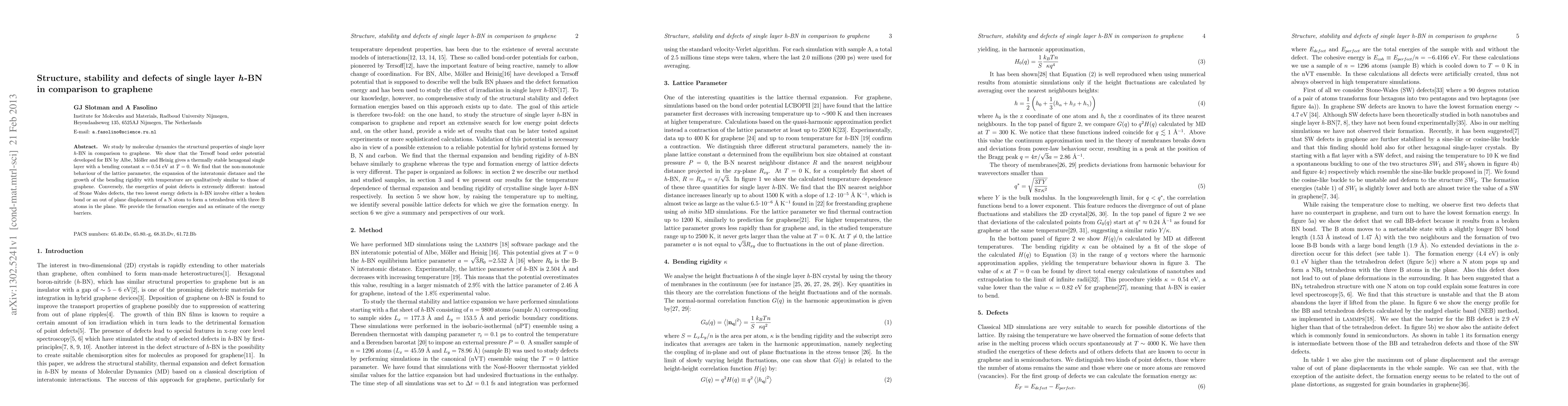 We study by molecular dynamics the structural properties of single layer h-BN in comparison to graphene. We show that the Tersoff bond order potential developed for BN by Albe, Moller and Heinig gives a thermally stable hexagonal single layer with a bending constant kappa= 0.54 eV at T = 0. We find that the non-monotonic behaviour of the lattice parameter, the expansion of the interatomic distance and the growth of the bending rigidity with temperature are qualitatively similar to those of graphene. Conversely, the energetics of point defects is extremely different: instead of Stone Wales defects, the two lowest energy defects in h-BN involve either a broken bond or an out of plane displacement of a N atom to form a tetrahedron with three B atoms in the plane. We provide the formation energies and an estimate of the energy barriers.