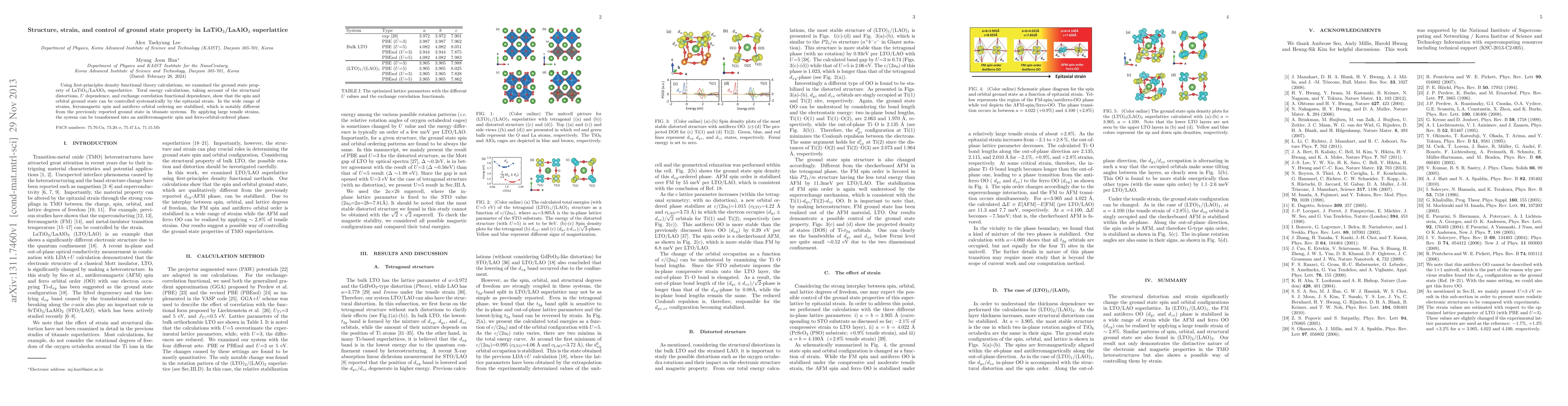 Using first-principles density functional theory calculations, we examined the ground state property of LaTiO$_3$/LaAlO$_3$ superlattice. Total energy calculations, taking account of the structural distortions, $U$ dependence, and exchange correlation functional dependence, show that the spin and orbital ground state can be controlled systematically by the epitaxial strain. In the wide range of strains, ferromagnetic spin and antiferro orbital ordering are stabilized, which is notably different from the previously reported ground state in titanate systems. By applying large tensile strains, the system can be transformed into an antiferromagnetic spin and ferro-orbital-ordered phase.