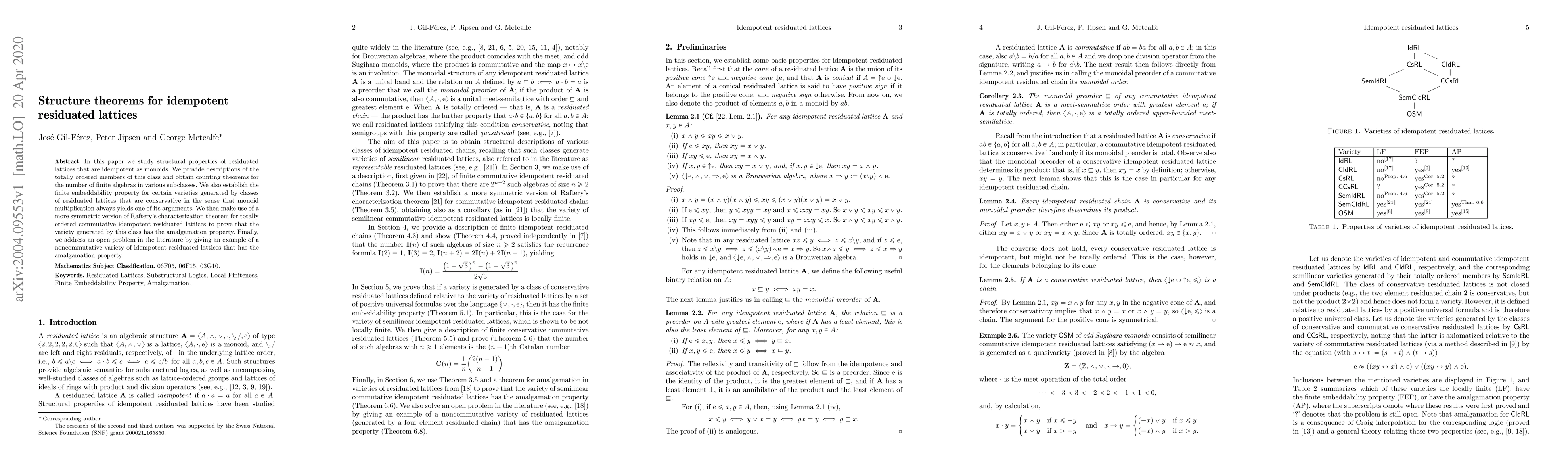 This paper explores structural properties of idempotent residuated lattices, focusing on totally ordered members and counting finite algebras in various subclasses. It establishes the finite embeddability and amalgamation properties for specific varieties of these lattices.