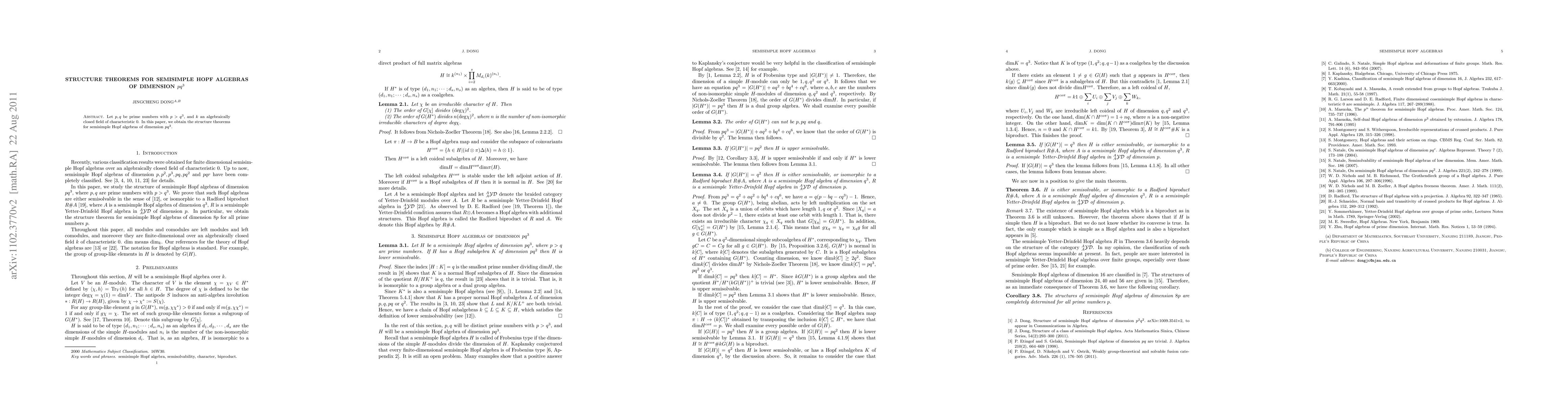 Summary: This research establishes structure theorems for semisimple Hopf algebras of dimension $pq^3$, where $p$ and $q$ are prime numbers with $p > q^3$, over an algebraically closed field of characteristic 0. The findings provide a comprehensive understanding of these Hopf algebras' internal structure.