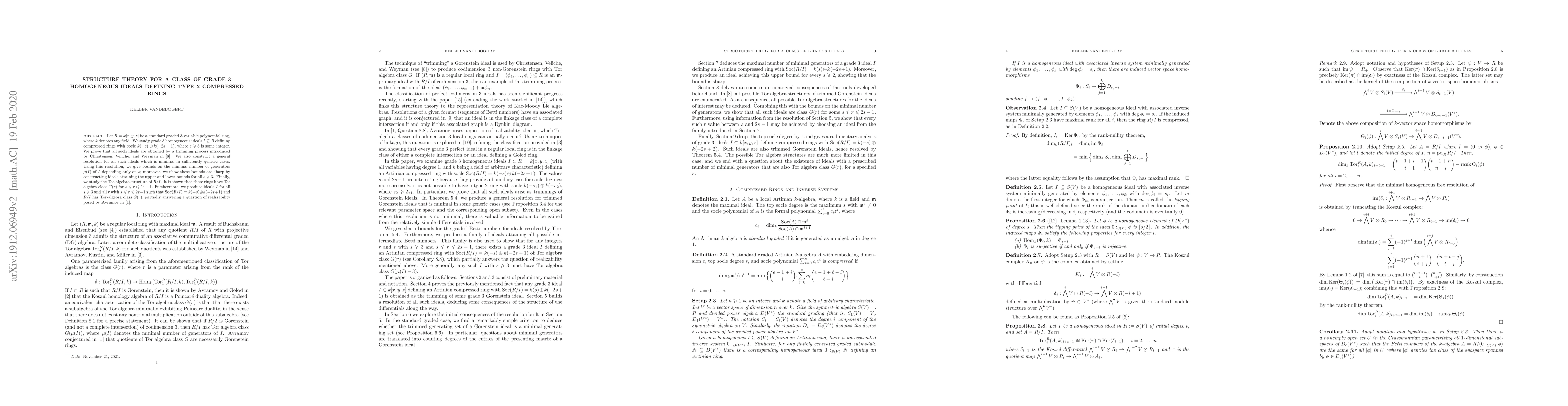 This paper investigates grade 3 homogeneous ideals in a polynomial ring $R=k[x,y,z]$ that define compressed rings with a specific socle structure. It proves that all such ideals arise via a trimming process and constructs a general minimal resolution. It also establishes sharp bounds on the number of generators of these ideals and explores their Tor-algebra structure, showing they have class $G(r)$ for certain $r$ values.