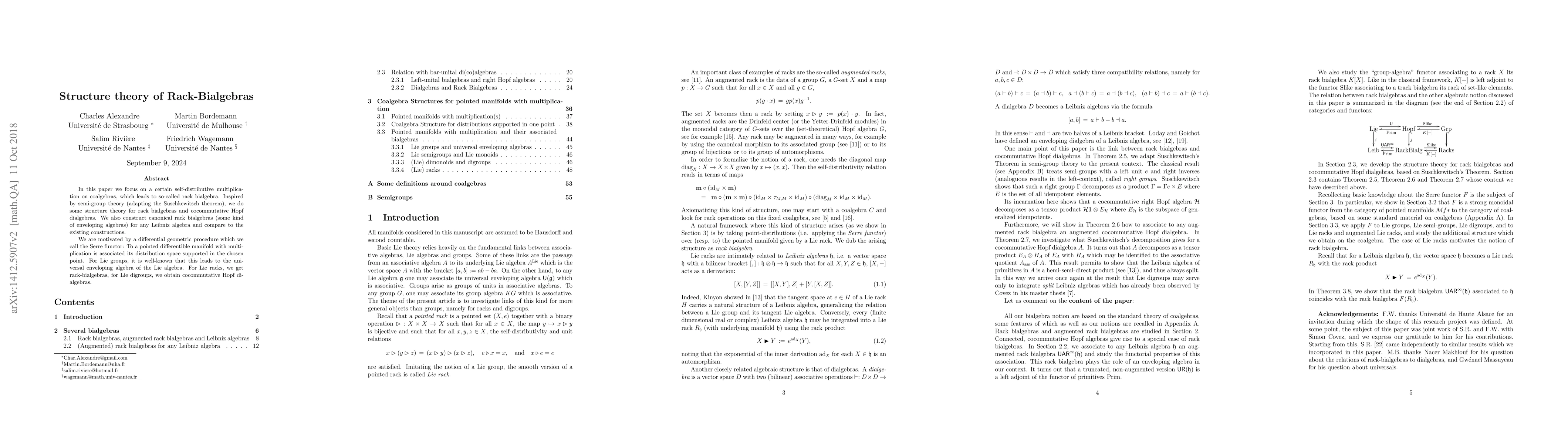 In this paper we focus on a certain self-distributive multiplication on coalgebras, which leads to so-called rack bialgebra. Inspired by semi-group theory (adapting the Suschkewitsch theorem), we do some structure theory for rack bialgebras and cocommutative Hopf dialgebras. We also construct canonical rack bialgebras (some kind of enveloping algebras) for any Leibniz algebra and compare to the existing constructions. We are motivated by a differential geometric procedure which we call the Serre functor: To a pointed differentible manifold with multiplication is associated its distribution space supported in the chosen point. For Lie groups, it is well-known that this leads to the universal enveloping algebra of the Lie algebra. For Lie racks, we get rack-bialgebras, for Lie digroups, we obtain cocommutative Hopf dialgebras.