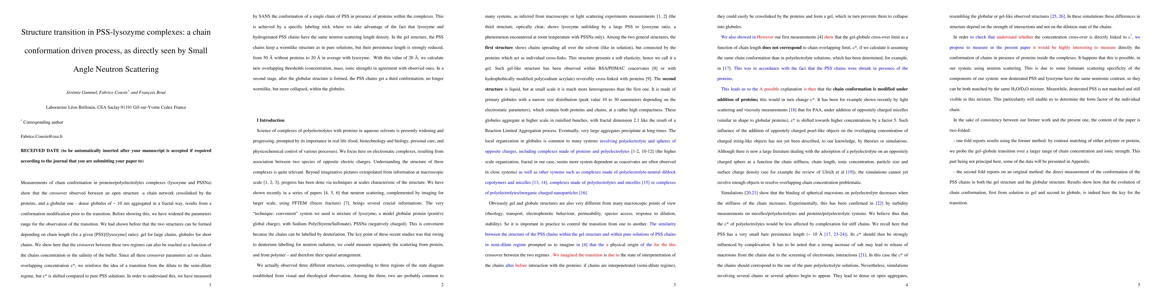 Measurements of chain conformation in proteins/polyelectrolytes complexes (lysozyme and PSSNa) show that the crossover observed between an open structure -a chain network crosslinked by the proteins, and a globular one - dense globules of ~ 10 nm aggregated in a fractal way, results from a conformation modification prior to the transition. Before showing this, we have widened the parameters range for the observation of the transition. We had shown before that the two structures can be formed depending on chain length (for a given [PSS]/[lysozyme] ratio): gel for large chains, globules for short chains. We show here that the crossover between these two regimes can also be reached as a function of chains concentration or salinity of the buffer. Since all these crossover parameters act on chains overlapping concentration c*, we reinforce the idea of a transition from the dilute to the semi-dilute regime, but c* is shifted compared to pure PSS solutions. In order to understand this, we have measured by SANS the conformation of a single chain of PSS in presence of proteins within the complexes. This is achieved by a specific labeling trick where we take advantage of the fact that lysozyme and hydrogenated PSS chains have the same neutron scattering length density. In the gel structure, the PSS chains keep a wormlike structure as in pure solutions, but their persistence length is strongly reduced, from 50 {\AA} without proteins to 20 {\AA} in average with lysozyme. With this value of 20 {\AA}, we calculate new overlapping thresholds (concentration, mass, ionic strength) in agreement with observed ones. In a second stage, after the globular structure is formed, the PSS chains get a third conformation, no longer wormlike, but more collapsed, within the globules.