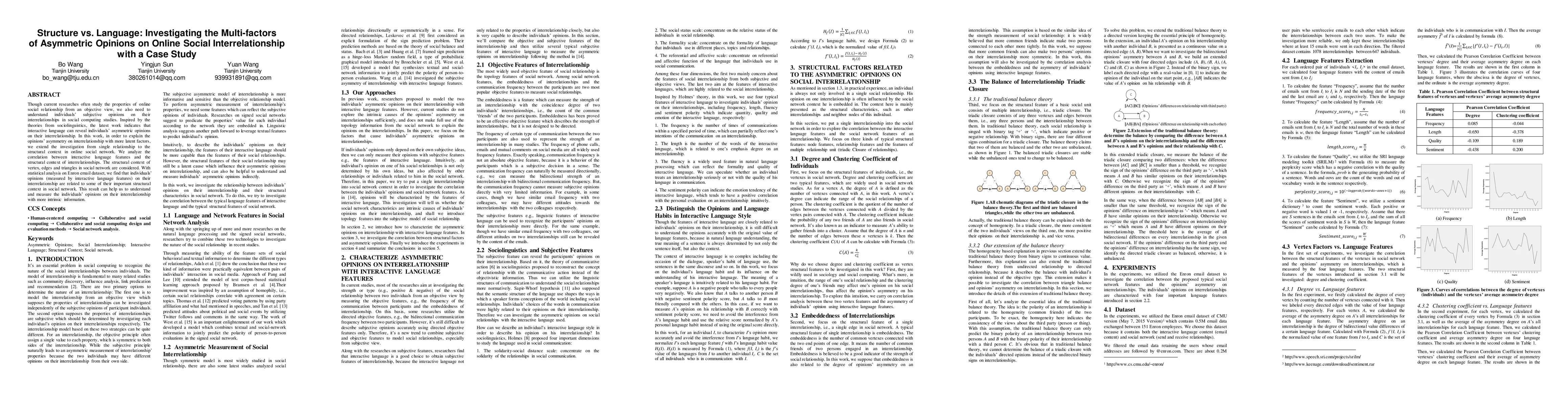 This paper investigates how individuals' subjective opinions on their online social interrelationships are influenced by both interactive language and structural context within social networks. Using Enron email data, it finds a correlation between language features and network structures like vertex, edges, and triangles, suggesting that both factors contribute to the asymmetry of opinions.