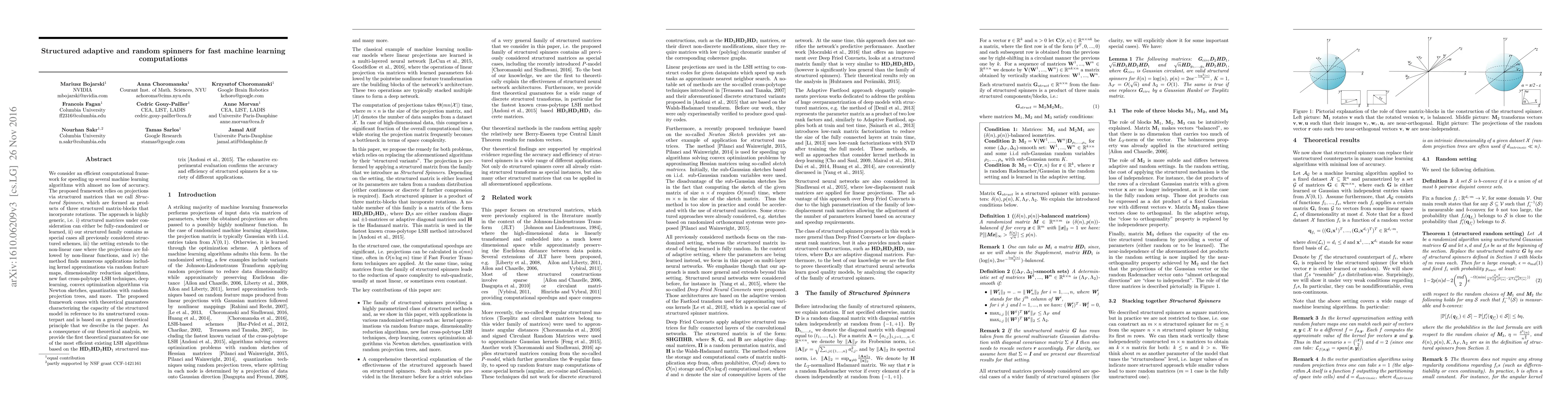 This paper proposes a computational framework using structured spinners—products of three structured matrix-blocks—to accelerate machine learning algorithms with minimal loss of accuracy. The framework is versatile and applicable to various scenarios, including kernel approximations, dimensionality reduction, and deep learning, backed by theoretical guarantees.