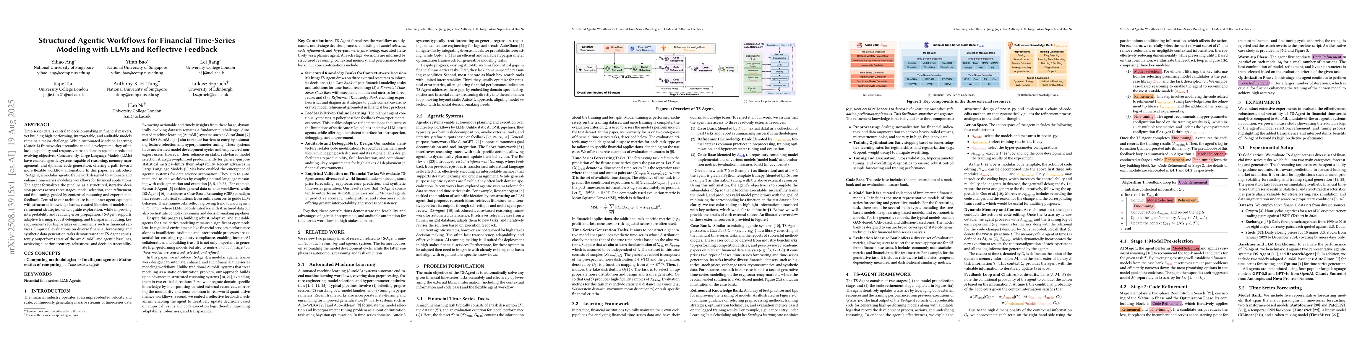 Time-series data is central to decision-making in financial markets, yet building high-performing, interpretable, and auditable models remains a major challenge. While Automated Machine Learning (AutoML) frameworks streamline model development, they often lack adaptability and responsiveness to domain-specific needs and evolving objectives. Concurrently, Large Language Models (LLMs) have enabled agentic systems capable of reasoning, memory management, and dynamic code generation, offering a path toward more flexible workflow automation. In this paper, we introduce \textsf{TS-Agent}, a modular agentic framework designed to automate and enhance time-series modeling workflows for financial applications. The agent formalizes the pipeline as a structured, iterative decision process across three stages: model selection, code refinement, and fine-tuning, guided by contextual reasoning and experimental feedback. Central to our architecture is a planner agent equipped with structured knowledge banks, curated libraries of models and refinement strategies, which guide exploration, while improving interpretability and reducing error propagation. \textsf{TS-Agent} supports adaptive learning, robust debugging, and transparent auditing, key requirements for high-stakes environments such as financial services. Empirical evaluations on diverse financial forecasting and synthetic data generation tasks demonstrate that \textsf{TS-Agent} consistently outperforms state-of-the-art AutoML and agentic baselines, achieving superior accuracy, robustness, and decision traceability.