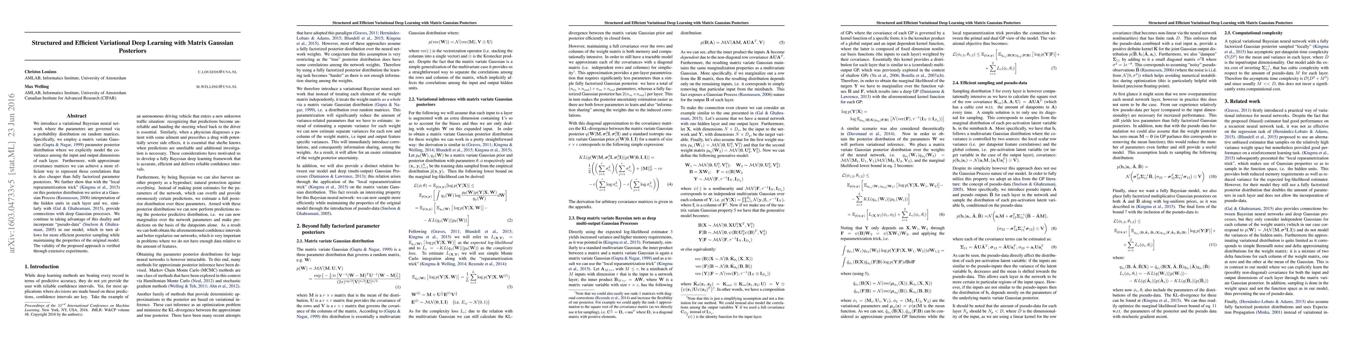 This paper proposes a variational Bayesian neural network using a matrix Gaussian posterior for layer parameters, enabling efficient modeling of covariance among input and output dimensions. It leverages the "local reparameterization trick" to interpret hidden units as Gaussian Processes, enhancing sampling efficiency while maintaining model properties.