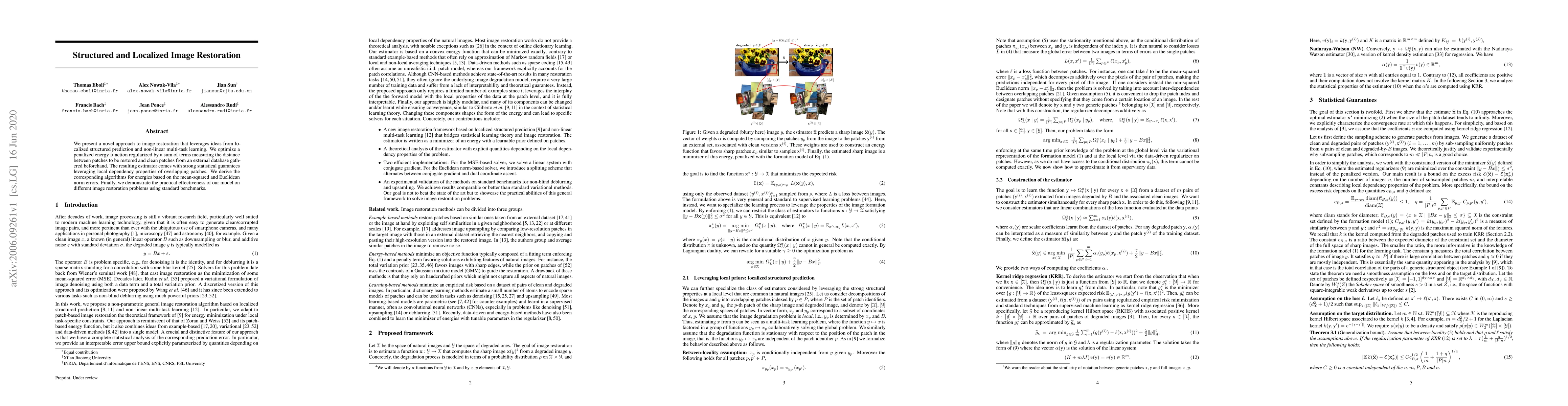 This paper proposes a novel image restoration approach using localized structured prediction and non-linear multi-task learning, achieving strong statistical guarantees with practical effectiveness on various benchmarks.