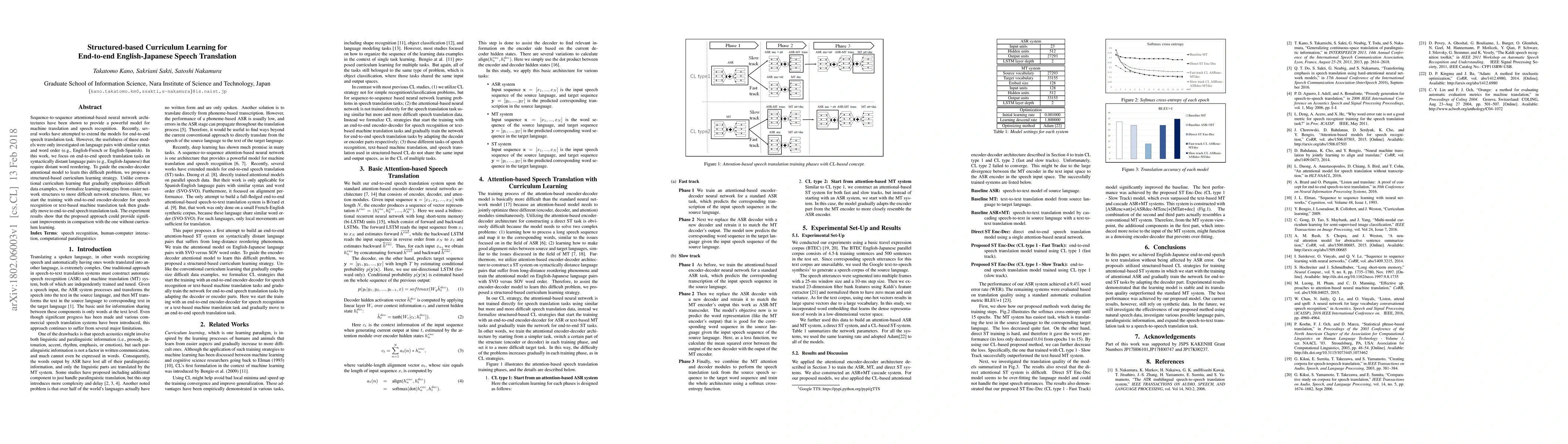 This paper proposes a structured-based curriculum learning strategy to improve end-to-end speech translation between syntactically distant language pairs like English and Japanese. The approach starts training with simpler tasks before progressing to the more complex speech translation task, achieving significant performance improvements.
