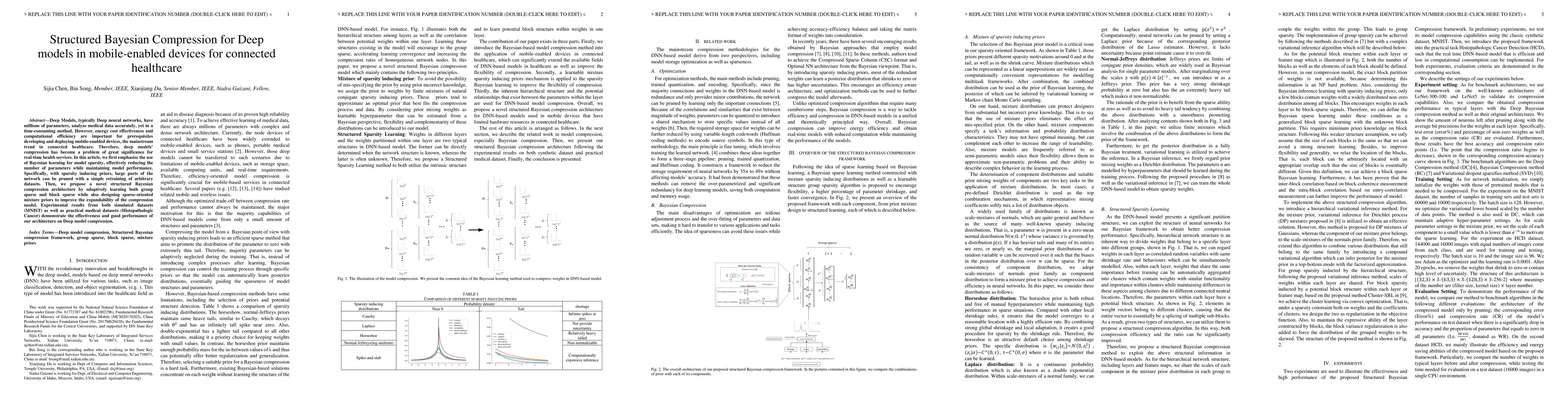 Summary: This paper proposes a structured Bayesian compression technique to enhance the energy efficiency and computational performance of deep neural networks for mobile-enabled devices in connected healthcare applications, aiming to balance accuracy with resource constraints. The approach seeks to reduce the time-consuming nature of deep models while maintaining high analytical precision.
