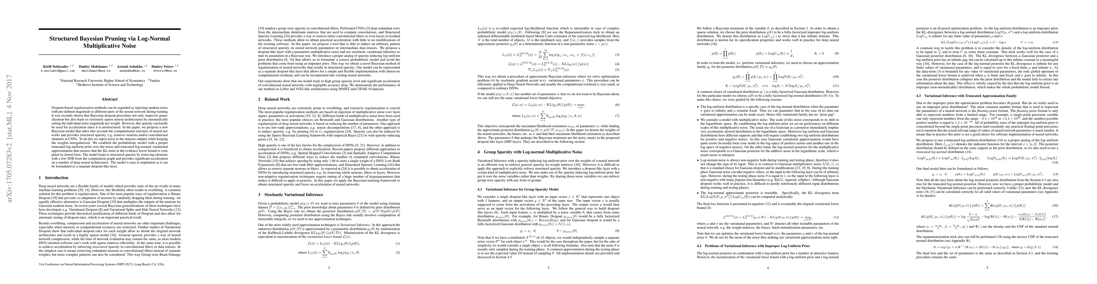 A new Bayesian model is proposed to achieve structured sparsity in neural networks through log-normal multiplicative noise injection, resulting in significant acceleration on deep architectures.