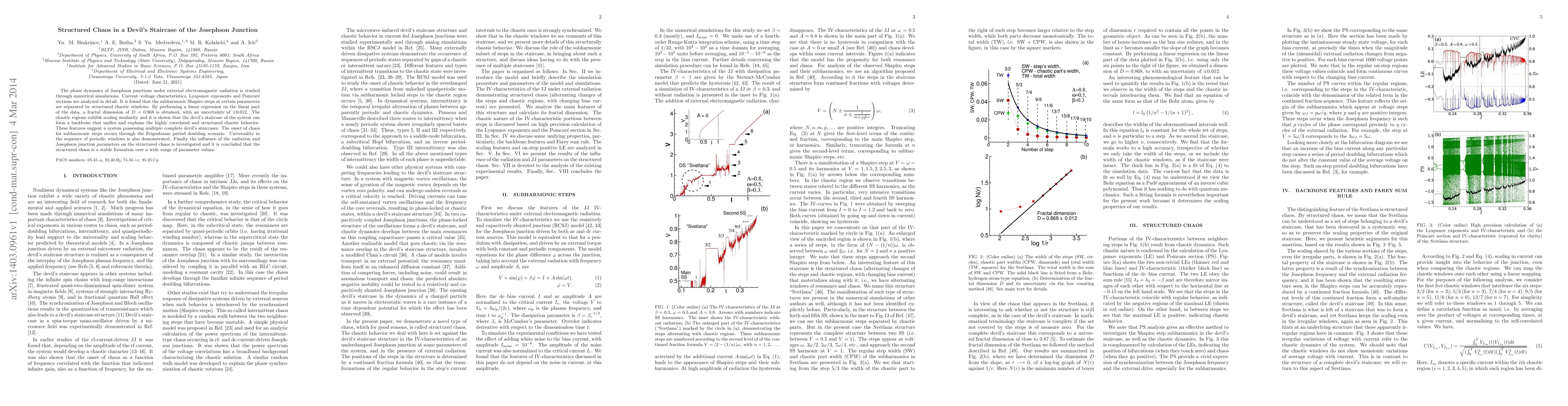The phase dynamics of Josephson junctions under external electromagnetic radiation is studied through numerical simulations. Current-voltage characteristics, Lyapunov exponents and Poincare sections are analyzed in detail. It is found that the subharmonic Shapiro steps at certain parameters are separated by structured chaotic windows. By performing a linear regression on the linear part of the data, a fractal dimension of D = 0.868 is obtained, with an uncertainty of +-0.012. The chaotic regions exhibit scaling similarity and it is shown that the devil's staircase of the system can form a backbone that unifies and explains the highly correlated and structured chaotic behavior. These features suggest a system possessing multiple complete devil's staircases. The onset of chaos for subharmonic steps occurs through the Feigenbaum period doubling scenario. Universality in the sequence of periodic windows is also demonstrated. Finally the influence of the radiation and Josephson junction parameters on the structured chaos is investigated and it is concluded that the structured chaos is a stable formation over a wide range of parameter values.