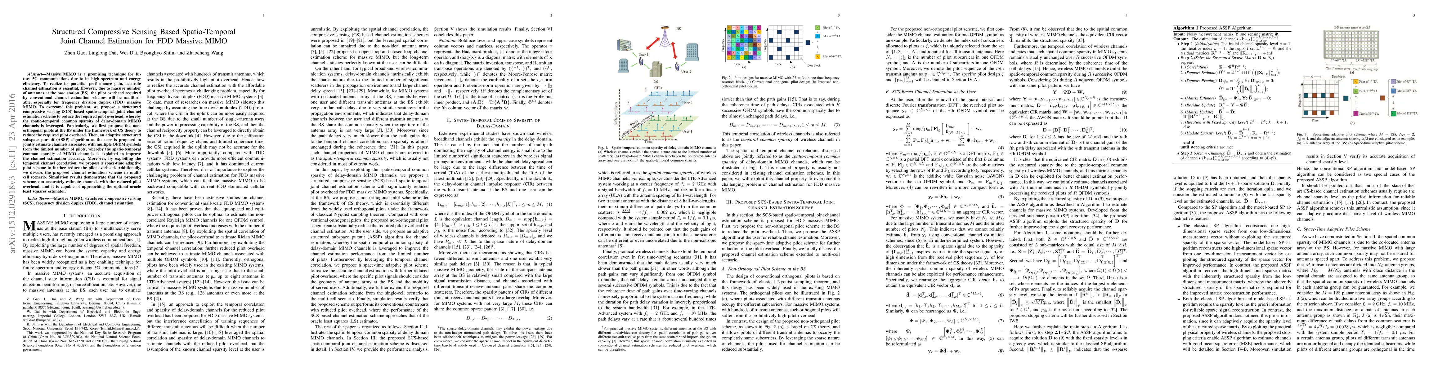This paper proposes a structured compressive sensing-based scheme to reduce pilot overhead in frequency division duplex massive MIMO systems, leveraging spatio-temporal common sparsity. The approach utilizes non-orthogonal pilots and adaptive structured subspace pursuit to achieve accurate channel estimation with minimal pilot usage.