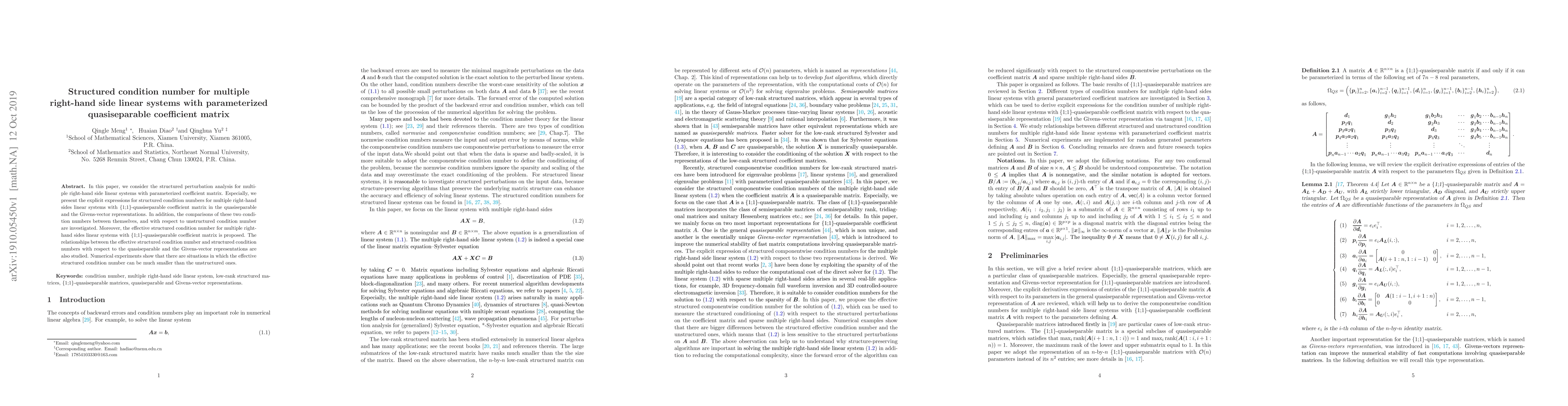 In this paper, we consider the structured perturbation analysis for multiple right-hand side linear systems with parameterized coefficient matrix. Especially, we present the explicit expressions for structured condition numbers for multiple right-hand sides linear systems with {1;1}-quasiseparable coefficient matrix in the quasiseparable and the Givens-vector representations. In addition, the comparisons of these two condition numbers between themselves, and with respect to unstructured condition number are investigated. Moreover, the effective structured condition number for multiple right-hand sides linear systems with {1;1}-quasiseparable coefficient matrix is proposed. The relationships between the effective structured condition number and structured condition numbers with respect to the quasiseparable and the Givens-vector representations are also studied. Numerical experiments show that there are situations in which the effective structured condition number can be much smaller than the unstructured ones.