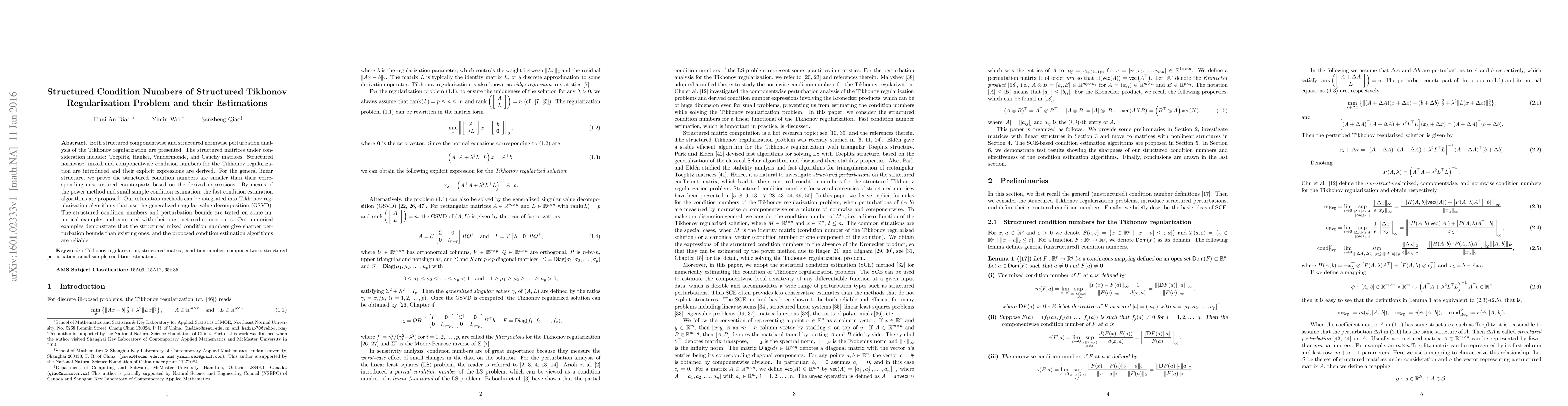 This paper presents structured perturbation analysis for Tikhonov regularization, introducing structured condition numbers for matrices like Toeplitz, Hankel, Vandermonde, and Cauchy. It demonstrates that structured condition numbers are smaller than unstructured ones, leading to sharper perturbation bounds, and proposes efficient estimation algorithms for these conditions.