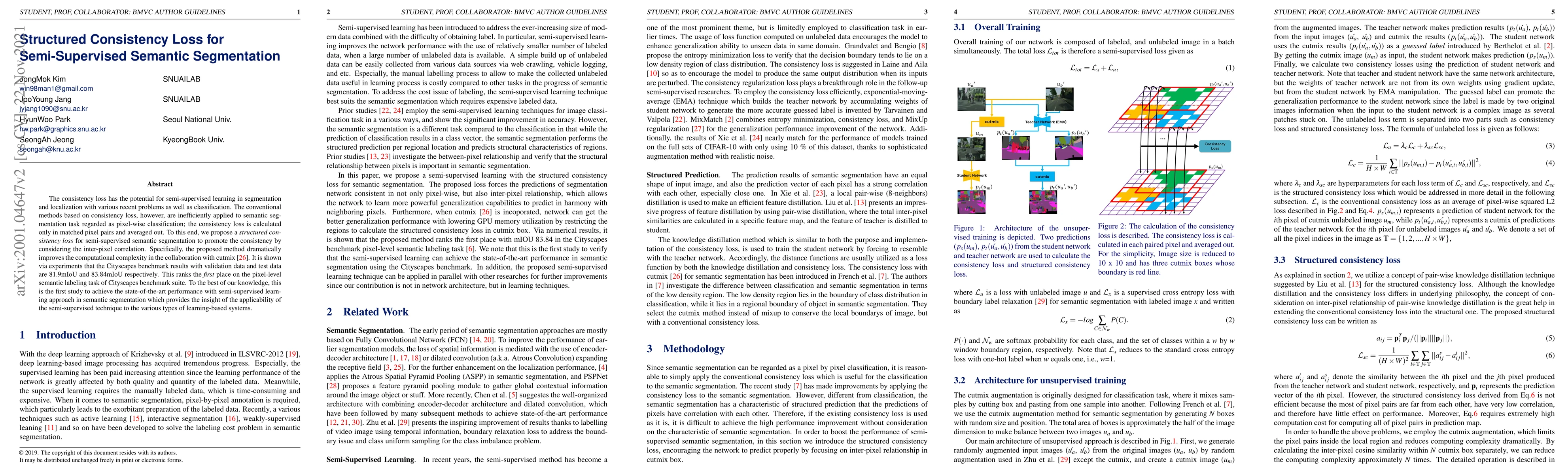 The paper proposes a structured consistency loss to enhance semi-supervised semantic segmentation, leveraging inter-pixel similarity and optimizing performance via CutMix. The method achieves top results on the Cityscapes benchmark, securing first place in pixel-level semantic labeling.