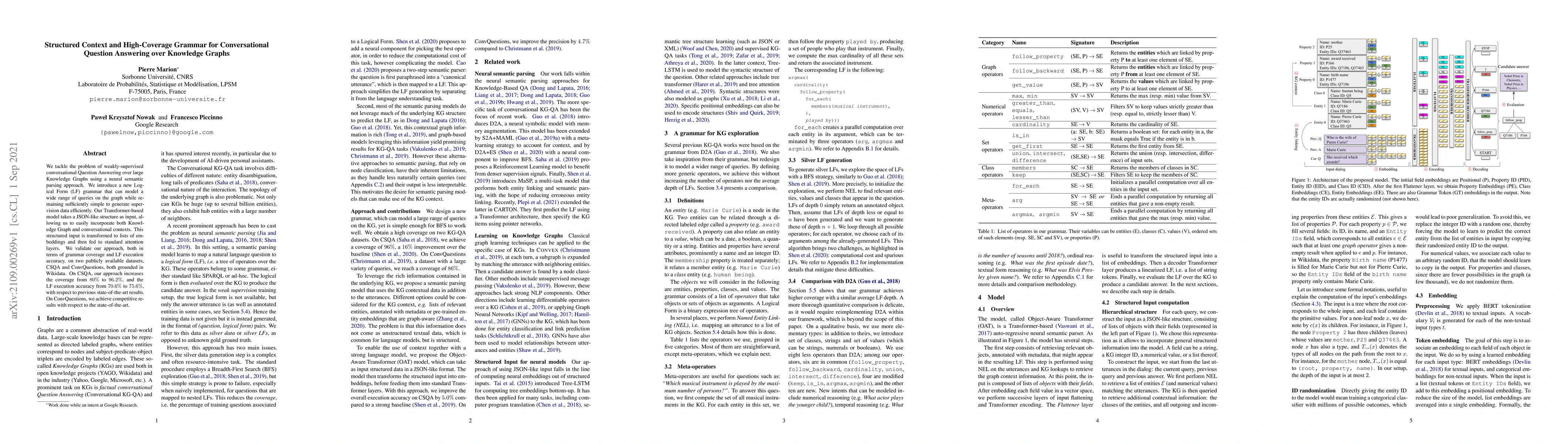 We tackle the problem of weakly-supervised conversational Question Answering over large Knowledge Graphs using a neural semantic parsing approach. We introduce a new Logical Form (LF) grammar that can model a wide range of queries on the graph while remaining sufficiently simple to generate supervision data efficiently. Our Transformer-based model takes a JSON-like structure as input, allowing us to easily incorporate both Knowledge Graph and conversational contexts. This structured input is transformed to lists of embeddings and then fed to standard attention layers. We validate our approach, both in terms of grammar coverage and LF execution accuracy, on two publicly available datasets, CSQA and ConvQuestions, both grounded in Wikidata. On CSQA, our approach increases the coverage from $80\%$ to $96.2\%$, and the LF execution accuracy from $70.6\%$ to $75.6\%$, with respect to previous state-of-the-art results. On ConvQuestions, we achieve competitive results with respect to the state-of-the-art.