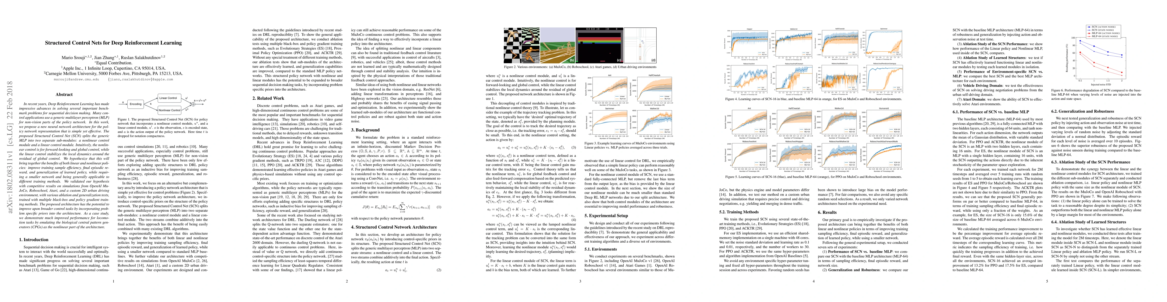 This paper proposes a new neural network architecture called Structured Control Net (SCN) for deep reinforcement learning, which splits a generic MLP into nonlinear and linear control modules to enhance training efficiency and policy generalization. The SCN demonstrates improved performance across various simulation environments and control tasks.