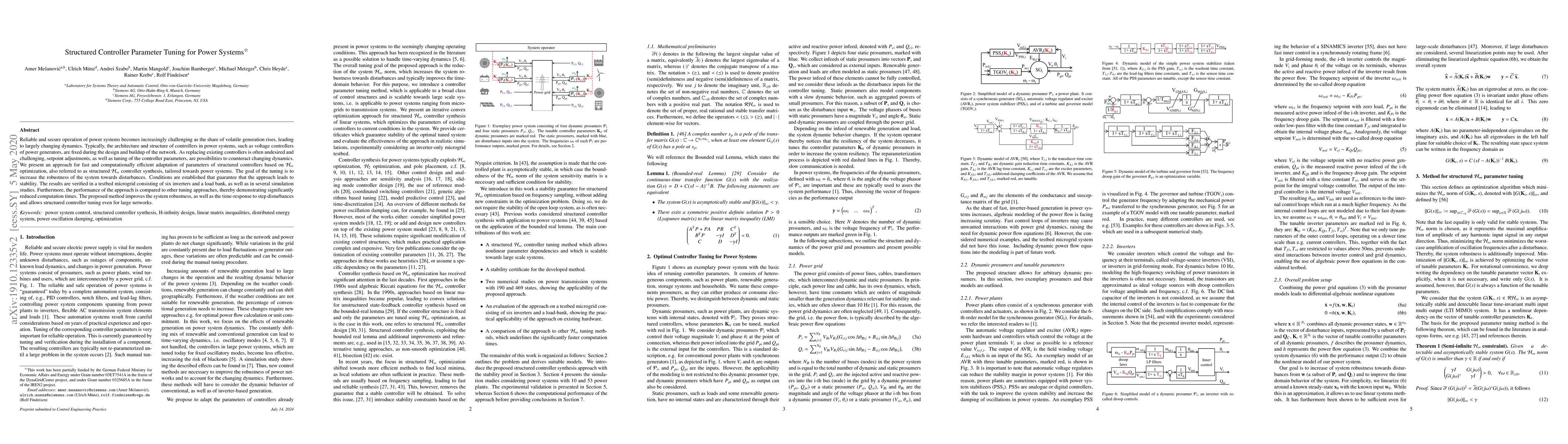 This paper proposes an H-infinity optimization method for fast and efficient tuning of structured controller parameters in power systems to enhance robustness and response to disturbances. The approach ensures stability and is demonstrated through a microgrid testbed and simulation studies.