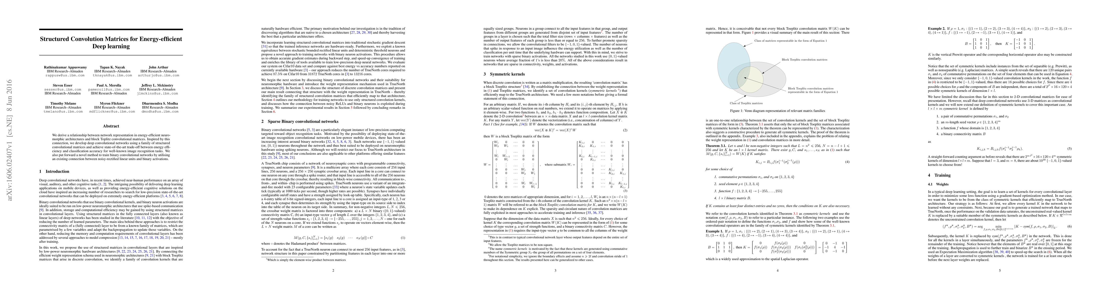 This paper proposes deep convolutional networks utilizing structured convolutional matrices to achieve a balance between energy efficiency and classification accuracy in neuromorphic architectures. The authors also introduce a novel training method for binary convolutional networks leveraging the relationship between noisy-rectified linear units and binary activations.