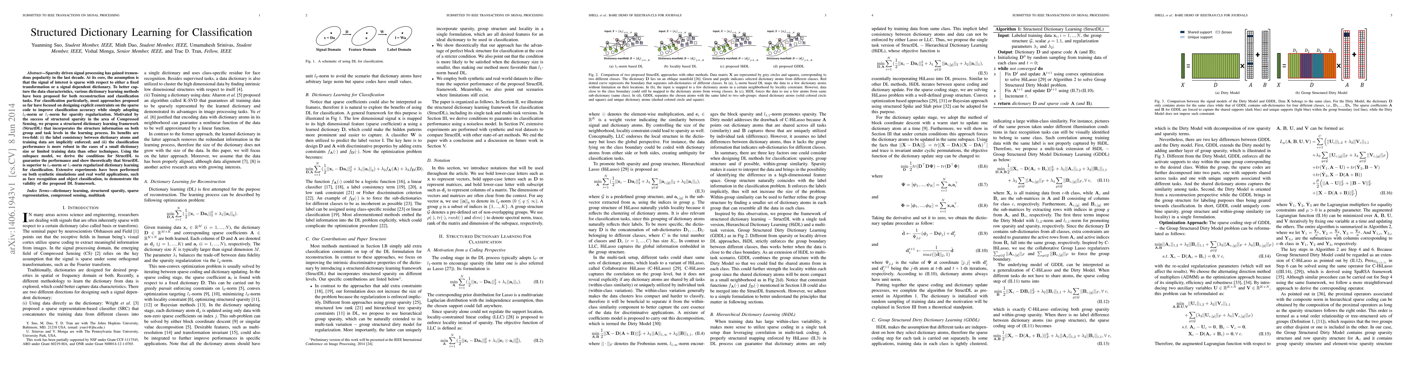 This paper proposes a structured dictionary learning framework (StructDL) to enhance classification by incorporating group and task structure information, which implicitly enforces label consistency and improves robustness, especially with limited data. Theoretical analysis and experiments on face and object recognition show StructDL's superior performance over traditional $l_0$-norm or $l_1$-norm methods.