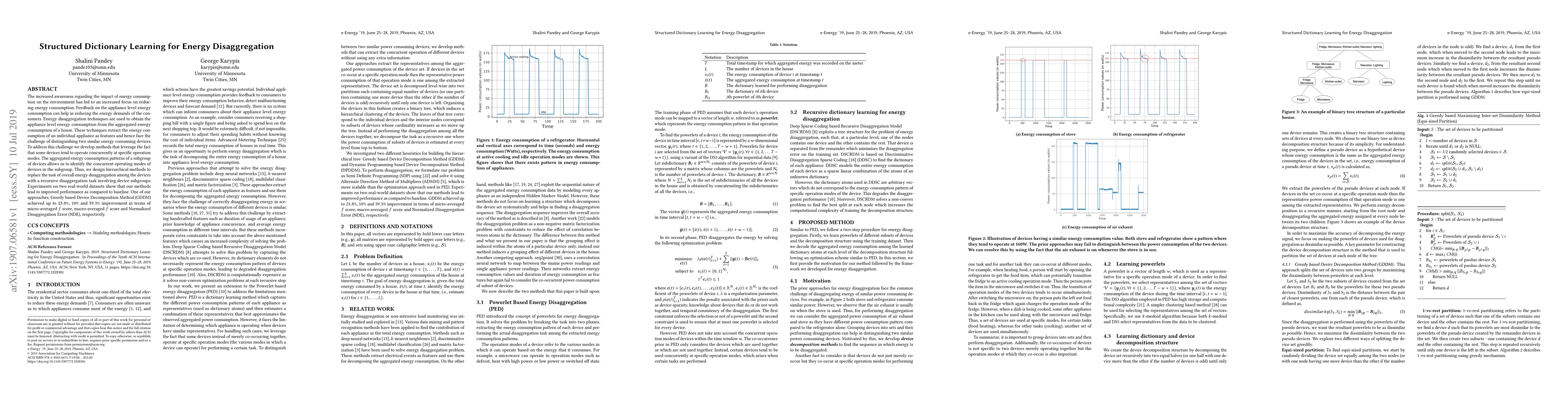 This paper proposes structured dictionary learning methods for energy disaggregation, focusing on distinguishing similar energy-consuming devices by leveraging concurrent operation modes. The hierarchical approach, including the Greedy based Device Decomposition Method (GDDM), shows significant improvements in disaggregation accuracy on real-world datasets.
