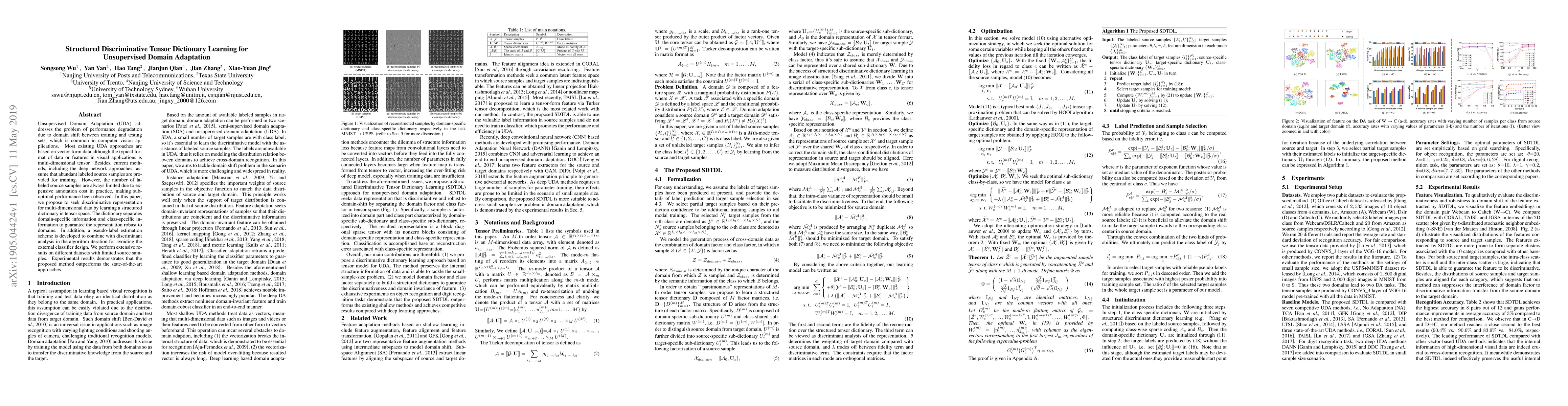 This paper proposes a structured discriminative tensor dictionary learning method for unsupervised domain adaptation, addressing the limitations of existing vector-based approaches. It leverages tensor representations to separate domain-specific and class-specific information, and integrates a pseudo-label estimation scheme to enhance performance with limited labeled source samples, outperforming state-of-the-art methods in experiments.