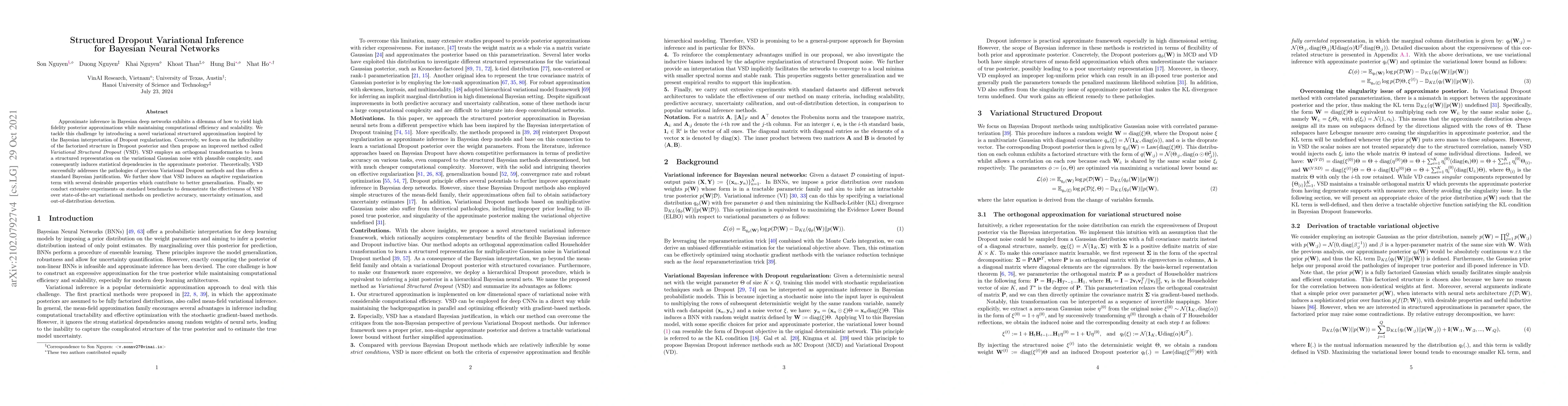 This paper introduces Variational Structured Dropout (VSD), a novel variational inference method for Bayesian neural networks that addresses the computational challenges of approximate inference. VSD employs an orthogonal transformation to induce statistical dependencies in the approximate posterior, improving upon previous Variational Dropout methods and demonstrating better generalization and predictive accuracy on benchmarks.