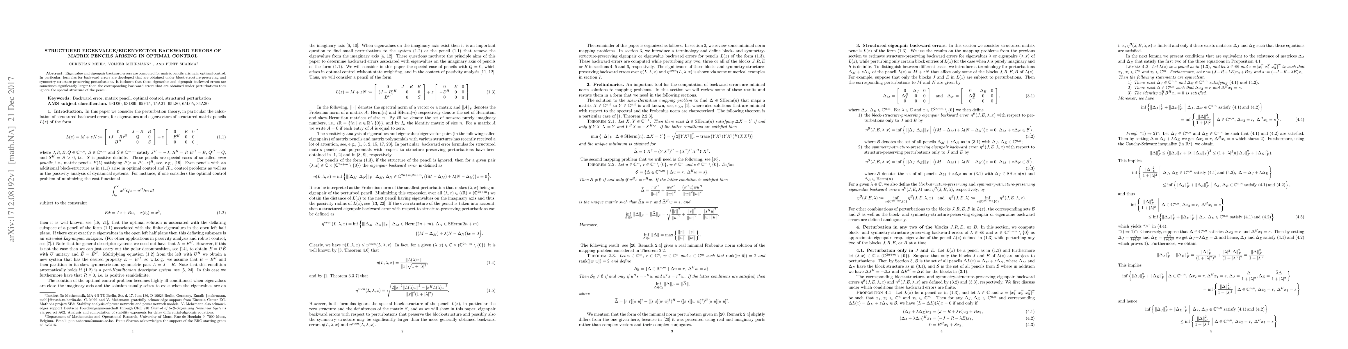 This paper computes eigenvalue and eigenpair backward errors for matrix pencils in optimal control, developing formulas that preserve block and symmetry structures. It demonstrates that structured errors can be significantly larger than those ignoring the pencil's special structure.