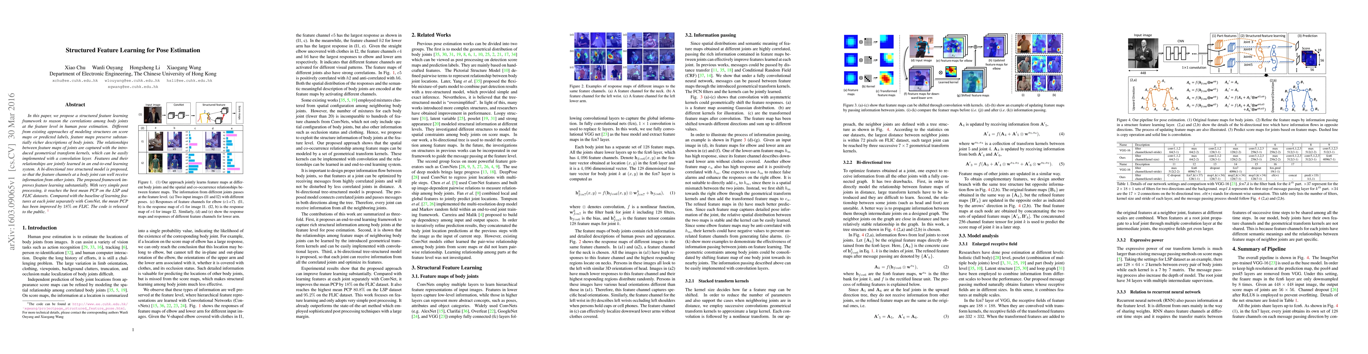 In this paper, we propose a structured feature learning framework to reason the correlations among body joints at the feature level in human pose estimation. Different from existing approaches of modelling structures on score maps or predicted labels, feature maps preserve substantially richer descriptions of body joints. The relationships between feature maps of joints are captured with the introduced geometrical transform kernels, which can be easily implemented with a convolution layer. Features and their relationships are jointly learned in an end-to-end learning system. A bi-directional tree structured model is proposed, so that the feature channels at a body joint can well receive information from other joints. The proposed framework improves feature learning substantially. With very simple post processing, it reaches the best mean PCP on the LSP and FLIC datasets. Compared with the baseline of learning features at each joint separately with ConvNet, the mean PCP has been improved by 18% on FLIC. The code is released to the public.