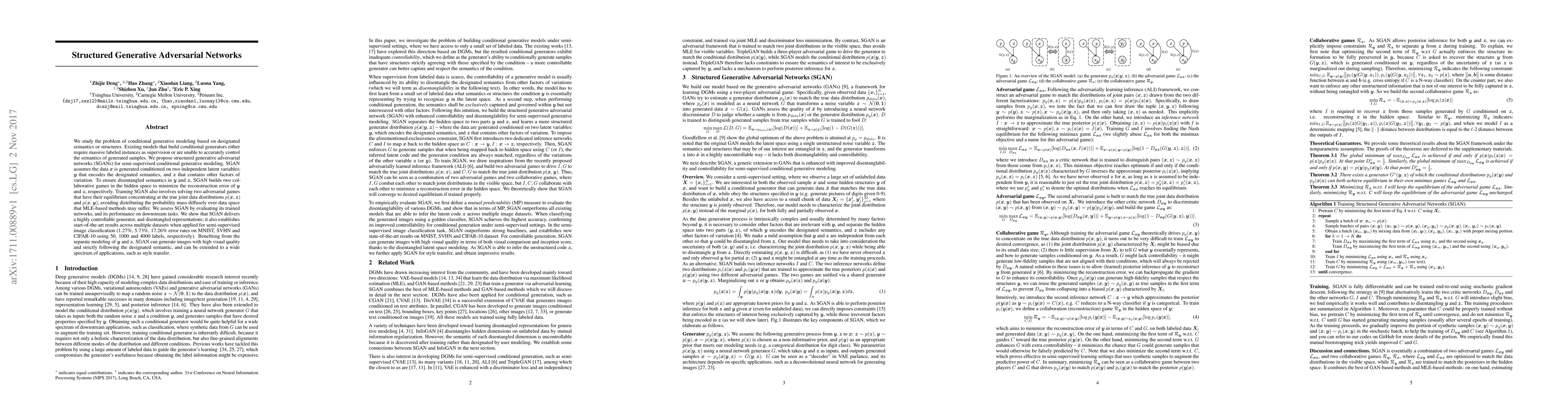 This paper proposes structured generative adversarial networks (SGANs) for semi-supervised conditional generative modeling, which disentangles semantic and variation factors in generated data. SGANs achieve superior performance in semi-supervised image classification and generate high-quality images that strictly follow designated semantics.