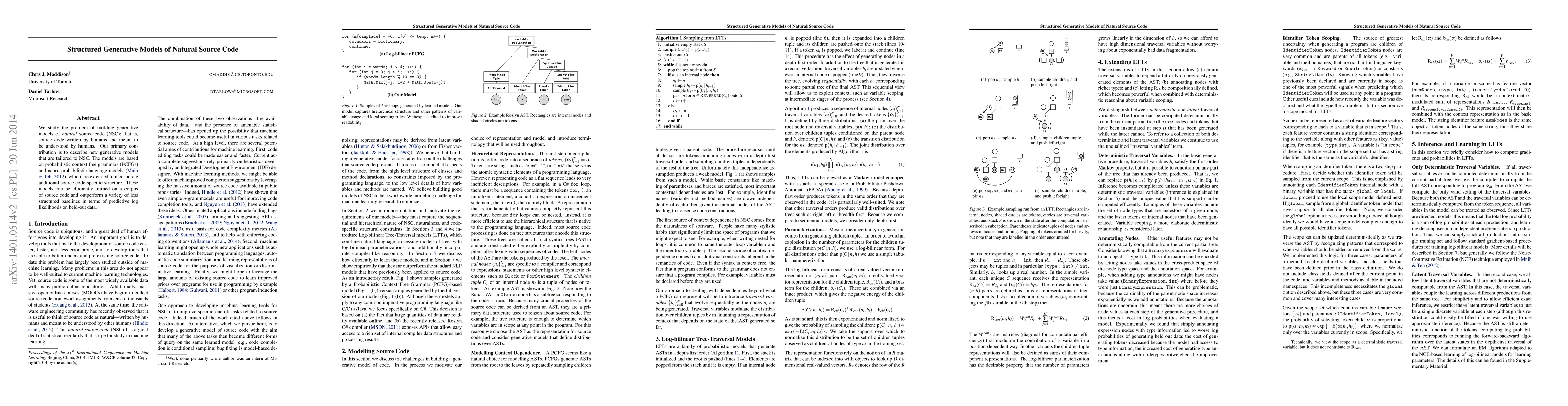 We study the problem of building generative models of natural source code (NSC); that is, source code written and understood by humans. Our primary contribution is to describe a family of generative models for NSC that have three key properties: First, they incorporate both sequential and hierarchical structure. Second, we learn a distributed representation of source code elements. Finally, they integrate closely with a compiler, which allows leveraging compiler logic and abstractions when building structure into the model. We also develop an extension that includes more complex structure, refining how the model generates identifier tokens based on what variables are currently in scope. Our models can be learned efficiently, and we show empirically that including appropriate structure greatly improves the models, measured by the probability of generating test programs.