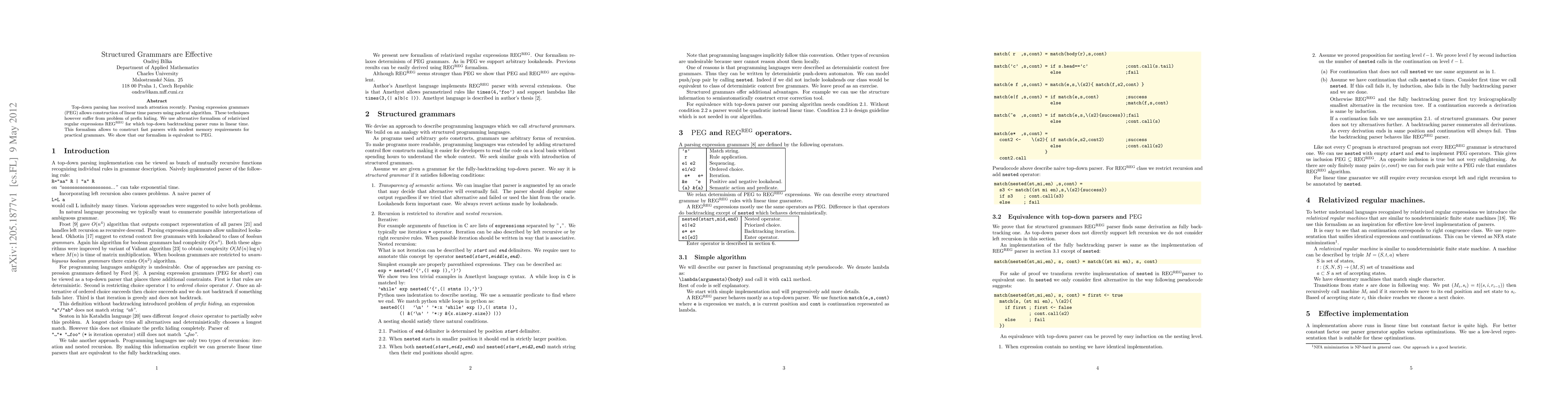 The paper introduces structured grammars, a generalization of Parsing Expression Grammars (PEGs), which allow for the generation of practical linear-time parsers. It utilizes a REGREG formalism and a reg functor for unified optimization and analysis.