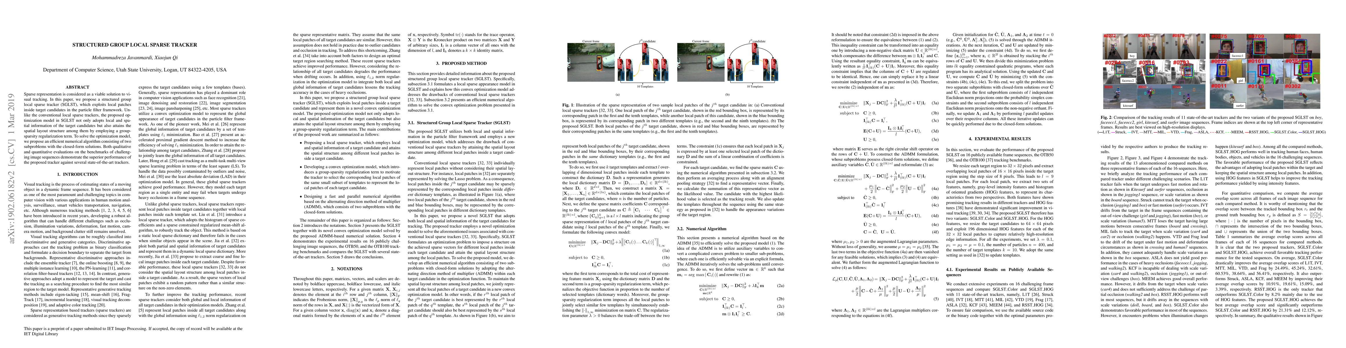 Sparse representation is considered as a viable solution to visual tracking. In this paper, we propose a structured group local sparse tracker (SGLST), which exploits local patches inside target candidates in the particle filter framework. Unlike the conventional local sparse trackers, the proposed optimization model in SGLST not only adopts local and spatial information of the target candidates but also attains the spatial layout structure among them by employing a group-sparsity regularization term. To solve the optimization model, we propose an efficient numerical algorithm consisting of two subproblems with the closed-form solutions. Both qualitative and quantitative evaluations on the benchmarks of challenging image sequences demonstrate the superior performance of the proposed tracker against several state-of-the-art trackers.
