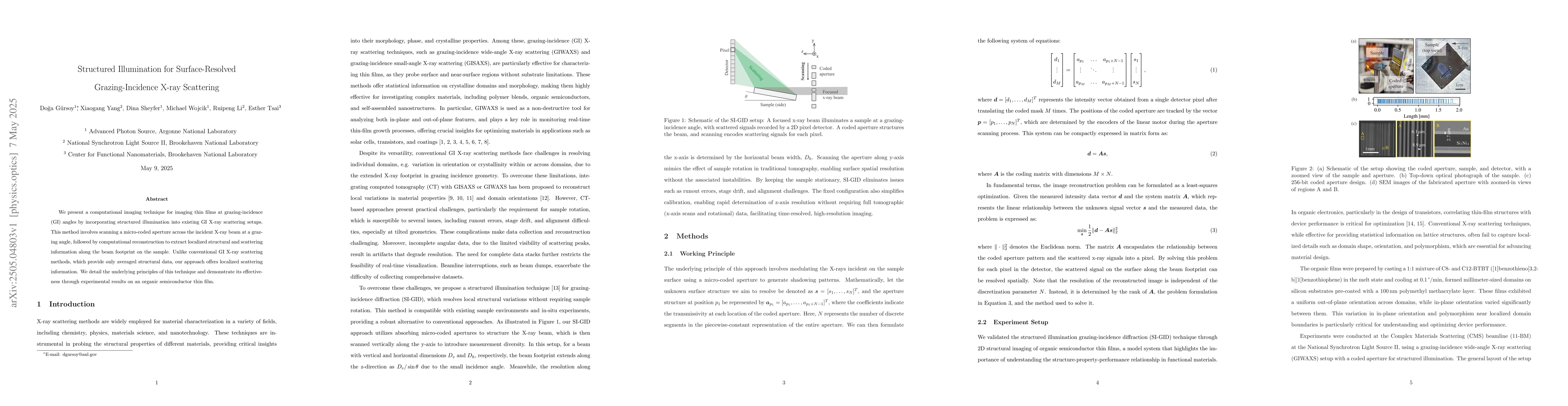 This paper introduces a computational imaging technique that uses structured illumination to obtain localized structural and scattering information from thin films at grazing-incidence X-ray angles, providing a significant improvement over conventional methods that yield only averaged data. Experimental results on an organic semiconductor thin film validate the effectiveness of the proposed method.