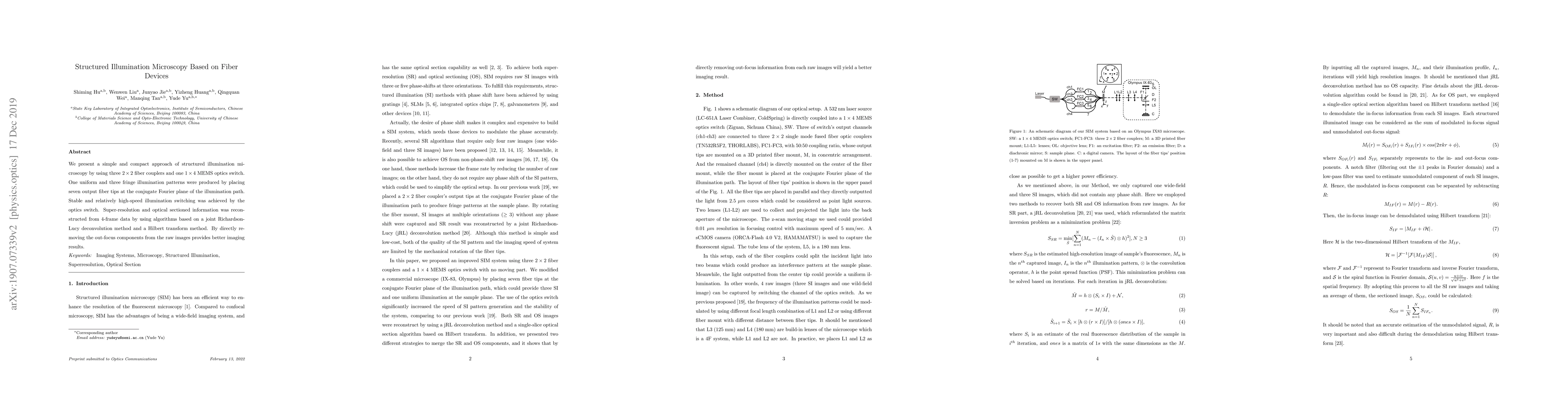 This paper introduces a compact structured illumination microscopy system utilizing fiber couplers and a MEMS switch for illumination pattern switching. It achieves super-resolution and optical sectioning through deconvolution and Hilbert transform methods, enhancing image clarity by removing out-of-focus components.