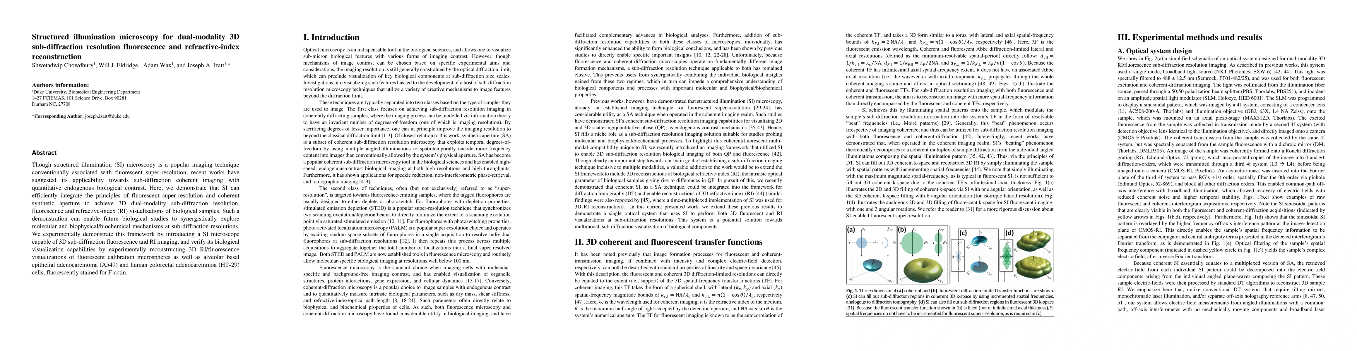 Structured illumination microscopy (SIM) is shown to achieve dual-modality 3D sub-diffraction resolution for both fluorescence and refractive-index imaging, enabling synergistic exploration of biological mechanisms. The developed SIM framework reconstructs 3D RI/fluorescence visualizations of biological samples, including cancer cells.
