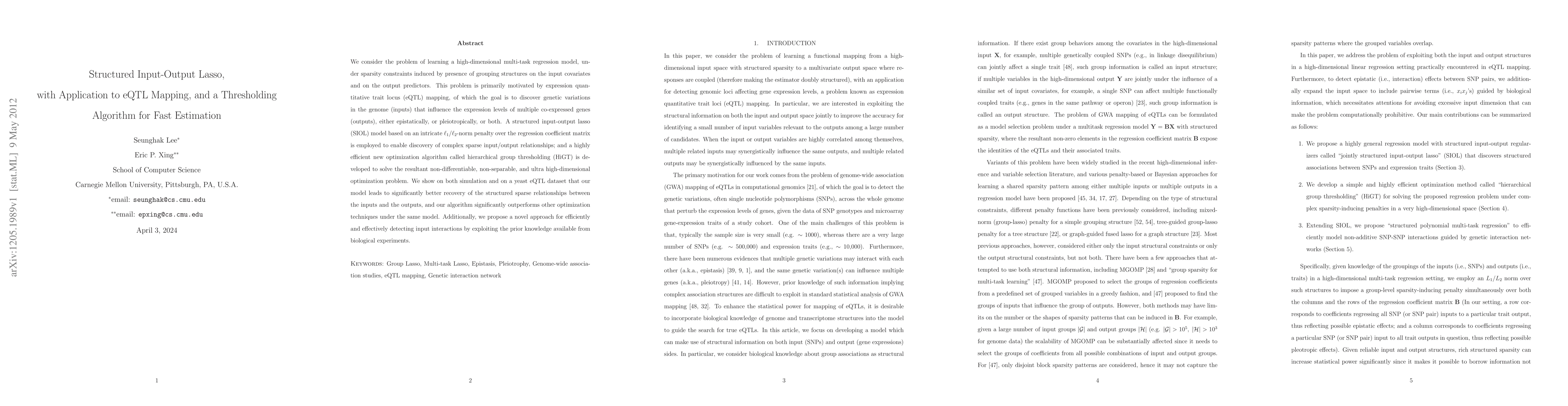 We consider the problem of learning a high-dimensional multi-task regression model, under sparsity constraints induced by presence of grouping structures on the input covariates and on the output predictors. This problem is primarily motivated by expression quantitative trait locus (eQTL) mapping, of which the goal is to discover genetic variations in the genome (inputs) that influence the expression levels of multiple co-expressed genes (outputs), either epistatically, or pleiotropically, or both. A structured input-output lasso (SIOL) model based on an intricate l1/l2-norm penalty over the regression coefficient matrix is employed to enable discovery of complex sparse input/output relationships; and a highly efficient new optimization algorithm called hierarchical group thresholding (HiGT) is developed to solve the resultant non-differentiable, non-separable, and ultra high-dimensional optimization problem. We show on both simulation and on a yeast eQTL dataset that our model leads to significantly better recovery of the structured sparse relationships between the inputs and the outputs, and our algorithm significantly outperforms other optimization techniques under the same model. Additionally, we propose a novel approach for efficiently and effectively detecting input interactions by exploiting the prior knowledge available from biological experiments.