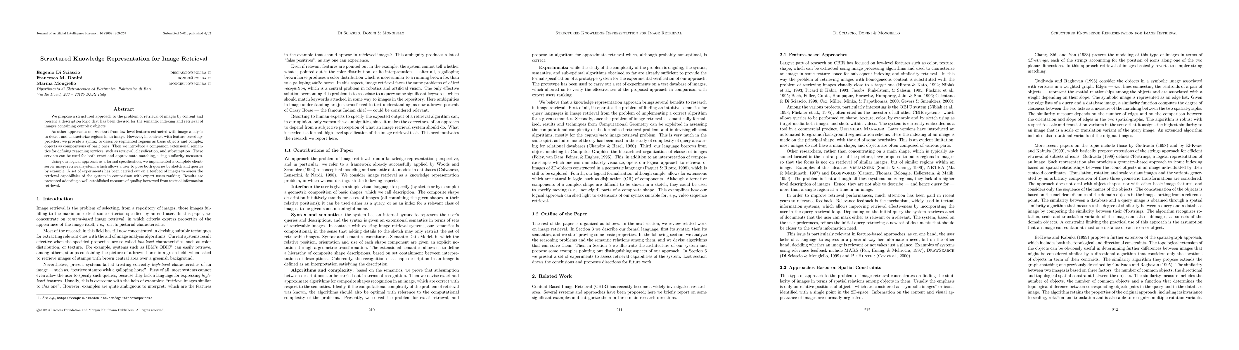 We propose a structured approach to the problem of retrieval of images by content and present a description logic that has been devised for the semantic indexing and retrieval of images containing complex objects. As other approaches do, we start from low-level features extracted with image analysis to detect and characterize regions in an image. However, in contrast with feature-based approaches, we provide a syntax to describe segmented regions as basic objects and complex objects as compositions of basic ones. Then we introduce a companion extensional semantics for defining reasoning services, such as retrieval, classification, and subsumption. These services can be used for both exact and approximate matching, using similarity measures. Using our logical approach as a formal specification, we implemented a complete client-server image retrieval system, which allows a user to pose both queries by sketch and queries by example. A set of experiments has been carried out on a testbed of images to assess the retrieval capabilities of the system in comparison with expert users ranking. Results are presented adopting a well-established measure of quality borrowed from textual information retrieval.