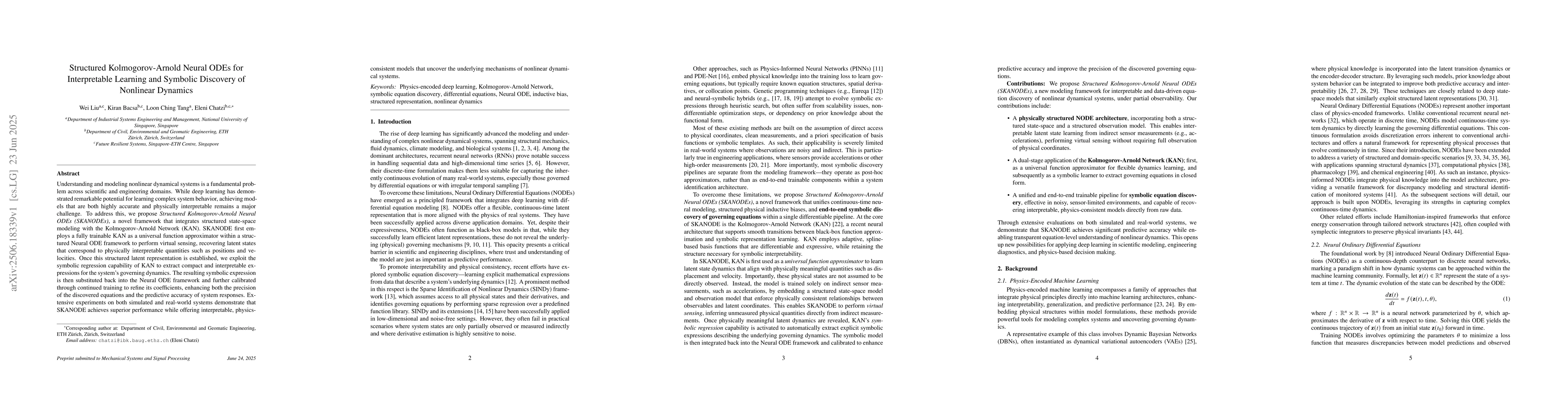 Understanding and modeling nonlinear dynamical systems is a fundamental problem across scientific and engineering domains. While deep learning has demonstrated remarkable potential for learning complex system behavior, achieving models that are both highly accurate and physically interpretable remains a major challenge. To address this, we propose Structured Kolmogorov-Arnold Neural ODEs (SKANODEs), a novel framework that integrates structured state-space modeling with the Kolmogorov-Arnold Network (KAN). SKANODE first employs a fully trainable KAN as a universal function approximator within a structured Neural ODE framework to perform virtual sensing, recovering latent states that correspond to physically interpretable quantities such as positions and velocities. Once this structured latent representation is established, we exploit the symbolic regression capability of KAN to extract compact and interpretable expressions for the system's governing dynamics. The resulting symbolic expression is then substituted back into the Neural ODE framework and further calibrated through continued training to refine its coefficients, enhancing both the precision of the discovered equations and the predictive accuracy of system responses. Extensive experiments on both simulated and real-world systems demonstrate that SKANODE achieves superior performance while offering interpretable, physics-consistent models that uncover the underlying mechanisms of nonlinear dynamical systems.