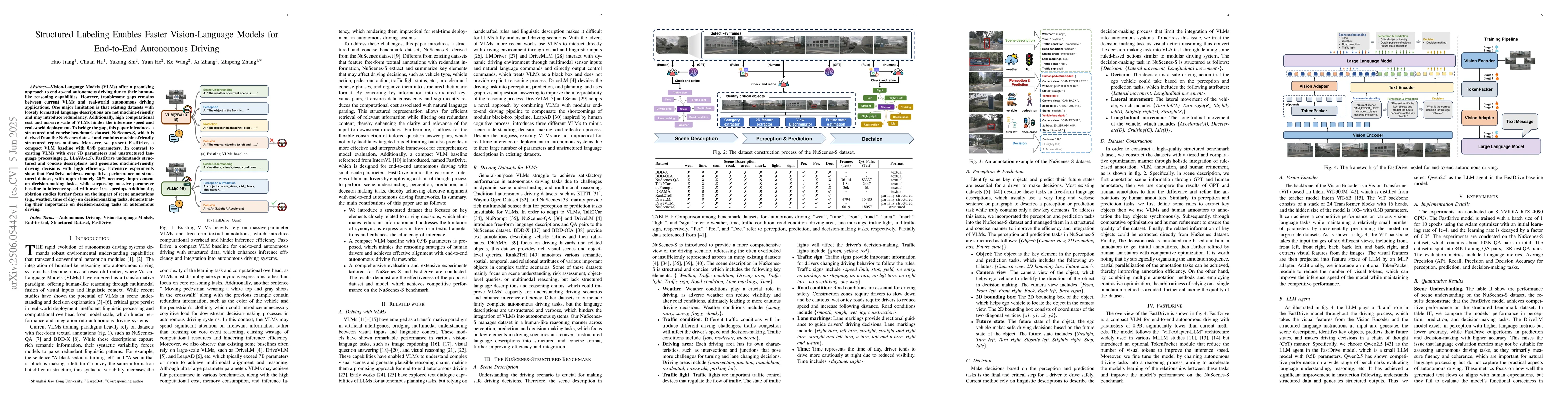Vision-Language Models (VLMs) offer a promising approach to end-to-end autonomous driving due to their human-like reasoning capabilities. However, troublesome gaps remains between current VLMs and real-world autonomous driving applications. One major limitation is that existing datasets with loosely formatted language descriptions are not machine-friendly and may introduce redundancy. Additionally, high computational cost and massive scale of VLMs hinder the inference speed and real-world deployment. To bridge the gap, this paper introduces a structured and concise benchmark dataset, NuScenes-S, which is derived from the NuScenes dataset and contains machine-friendly structured representations. Moreover, we present FastDrive, a compact VLM baseline with 0.9B parameters. In contrast to existing VLMs with over 7B parameters and unstructured language processing(e.g., LLaVA-1.5), FastDrive understands structured and concise descriptions and generates machine-friendly driving decisions with high efficiency. Extensive experiments show that FastDrive achieves competitive performance on structured dataset, with approximately 20% accuracy improvement on decision-making tasks, while surpassing massive parameter baseline in inference speed with over 10x speedup. Additionally, ablation studies further focus on the impact of scene annotations (e.g., weather, time of day) on decision-making tasks, demonstrating their importance on decision-making tasks in autonomous driving.